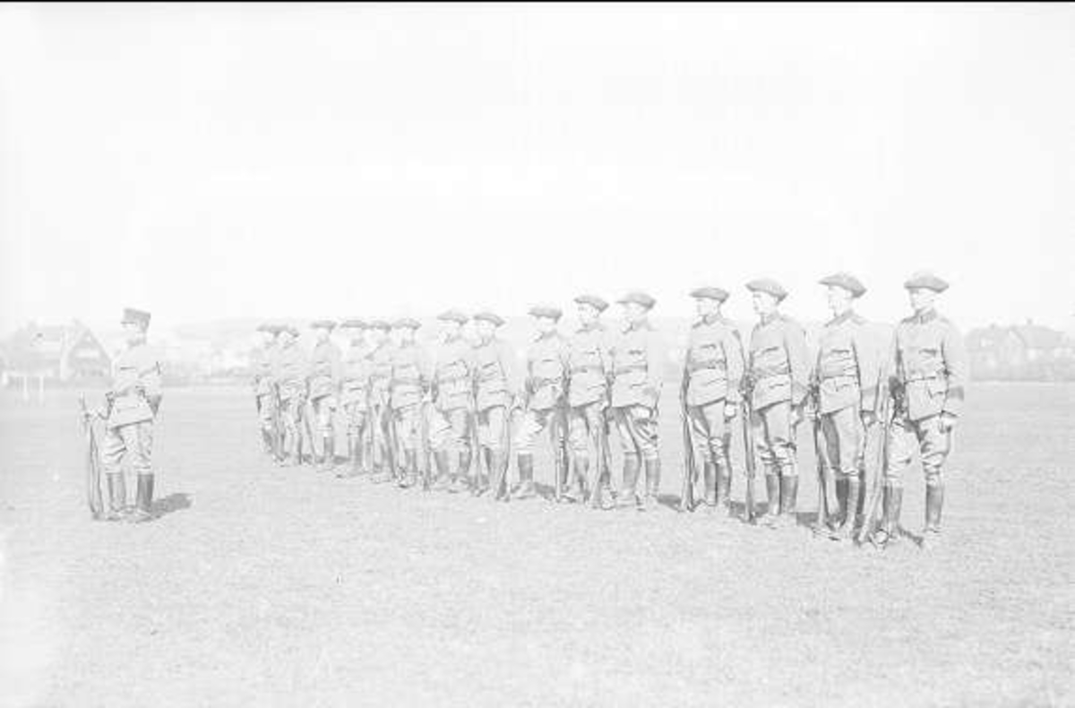 Utbildning med vpl till häst på södra fältet. Uniform m/10 med "trekantshatt".