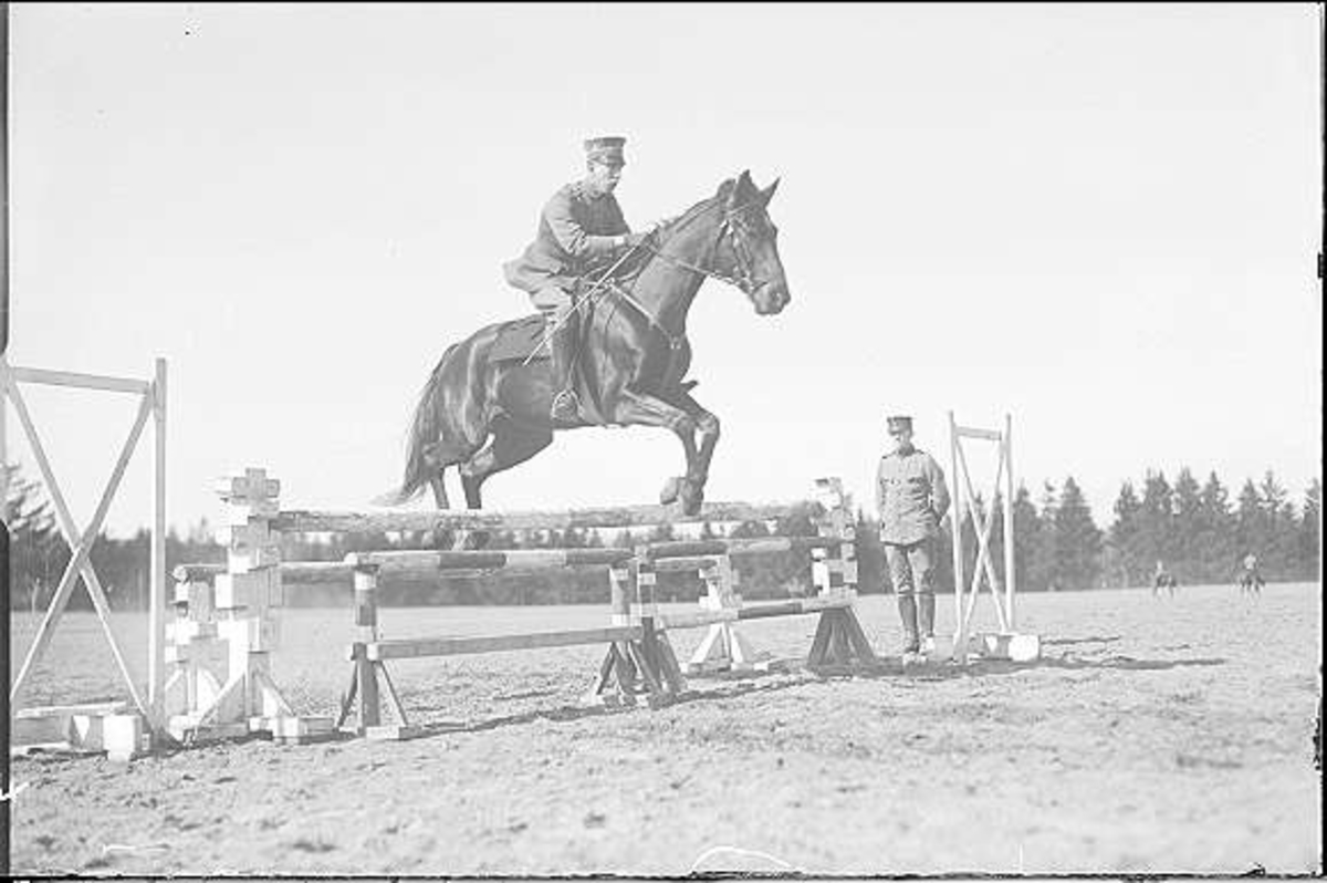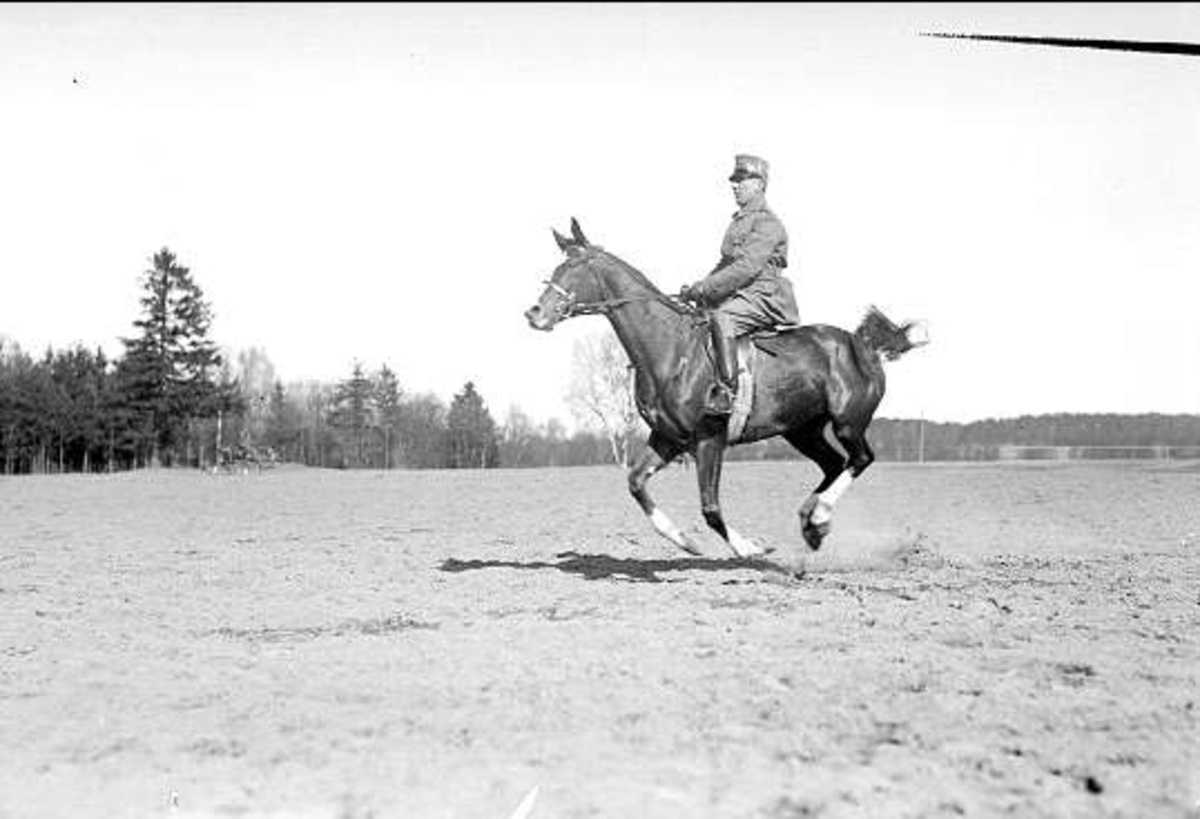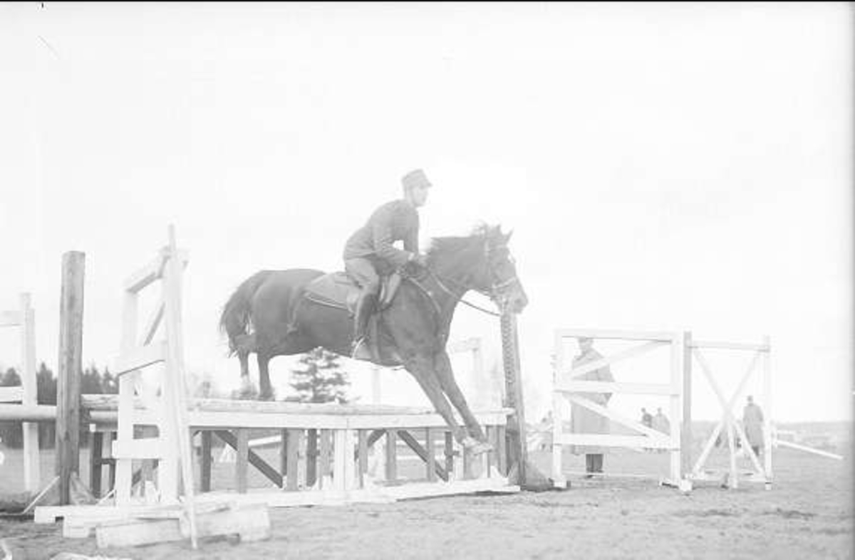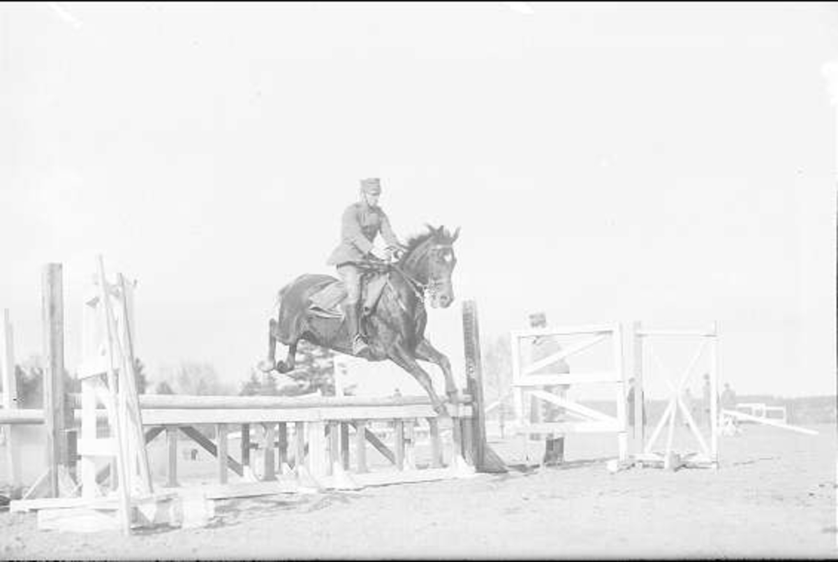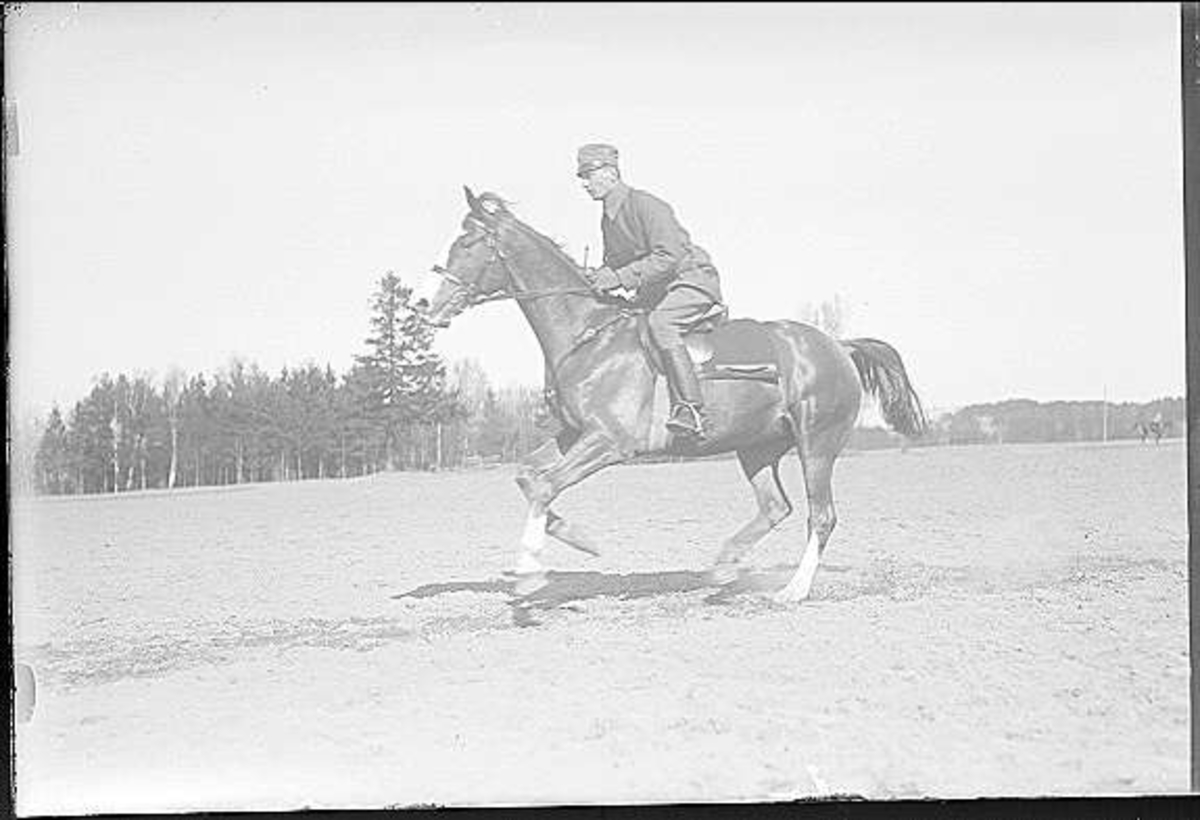 Regementskapplöpningar på fältet söder K 3 kasern. Jaktlopp för furirer passerar just över jordvallen öster I 9 kasernvakt. Närmast kameran furir Ragnar Seipel, senare fanjunkare K 3.