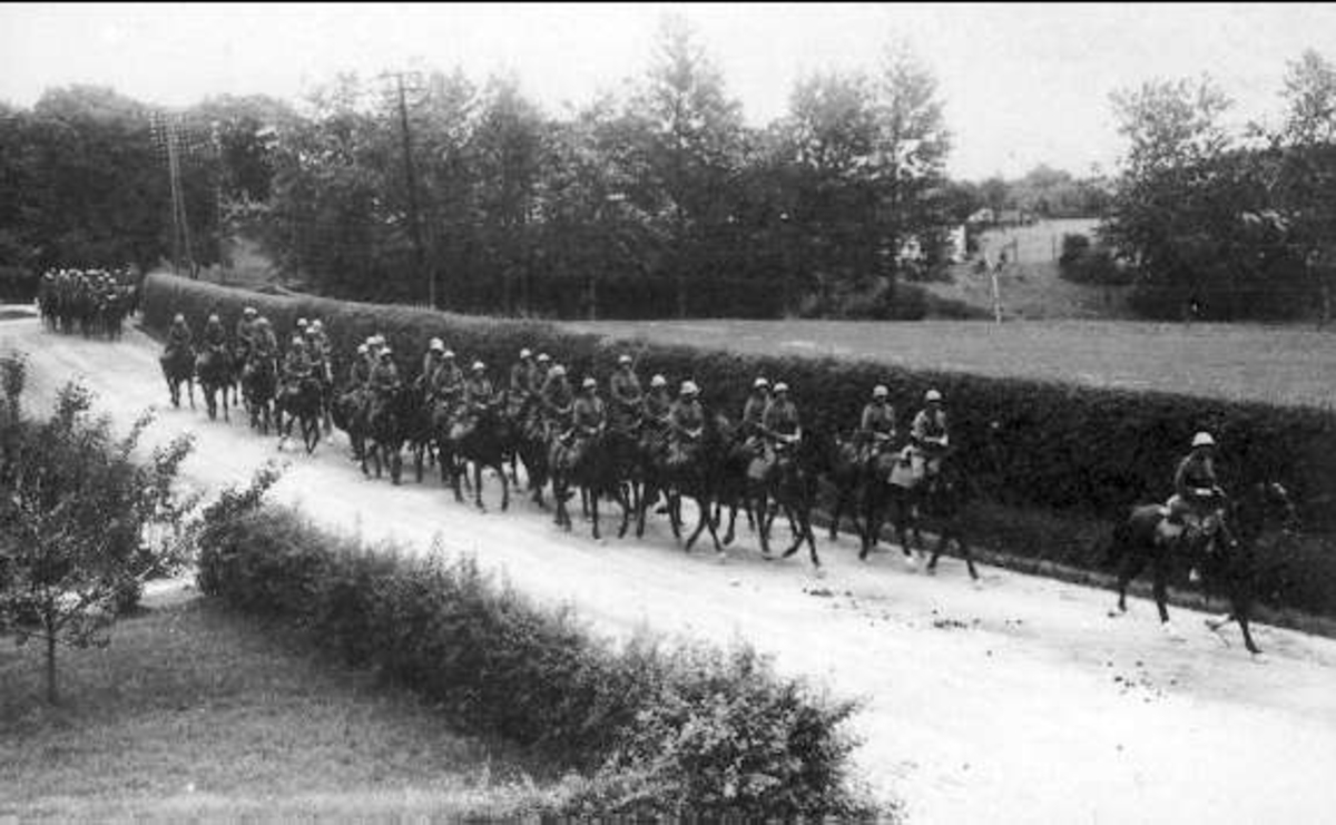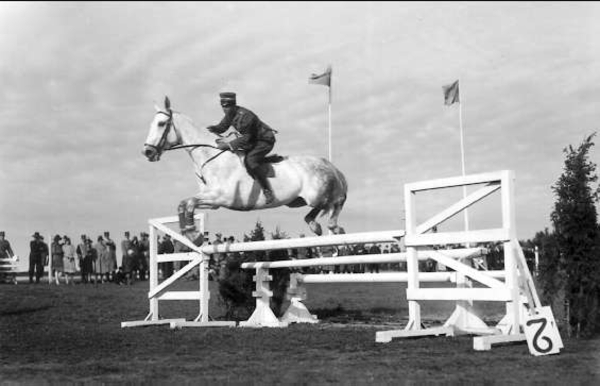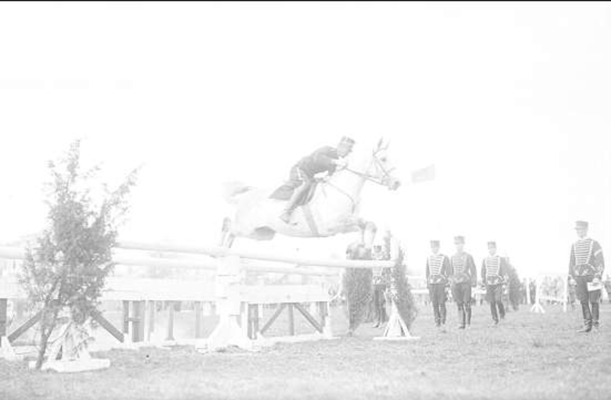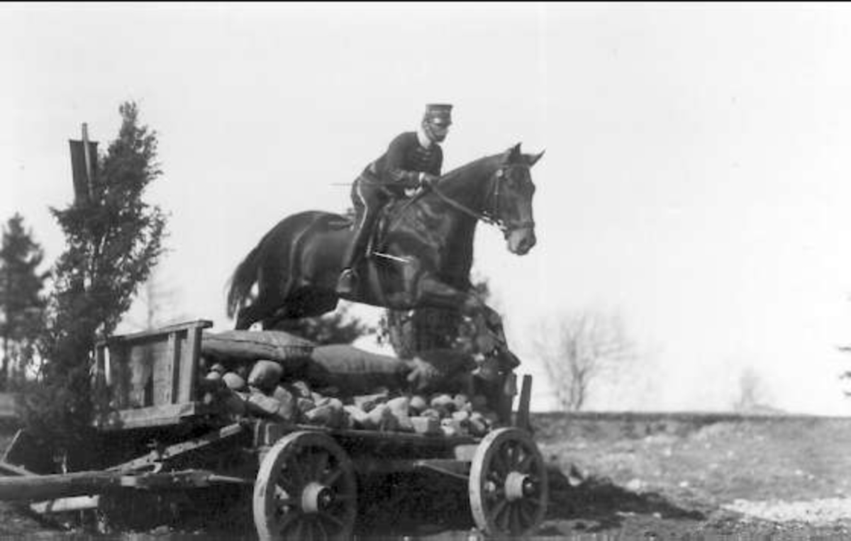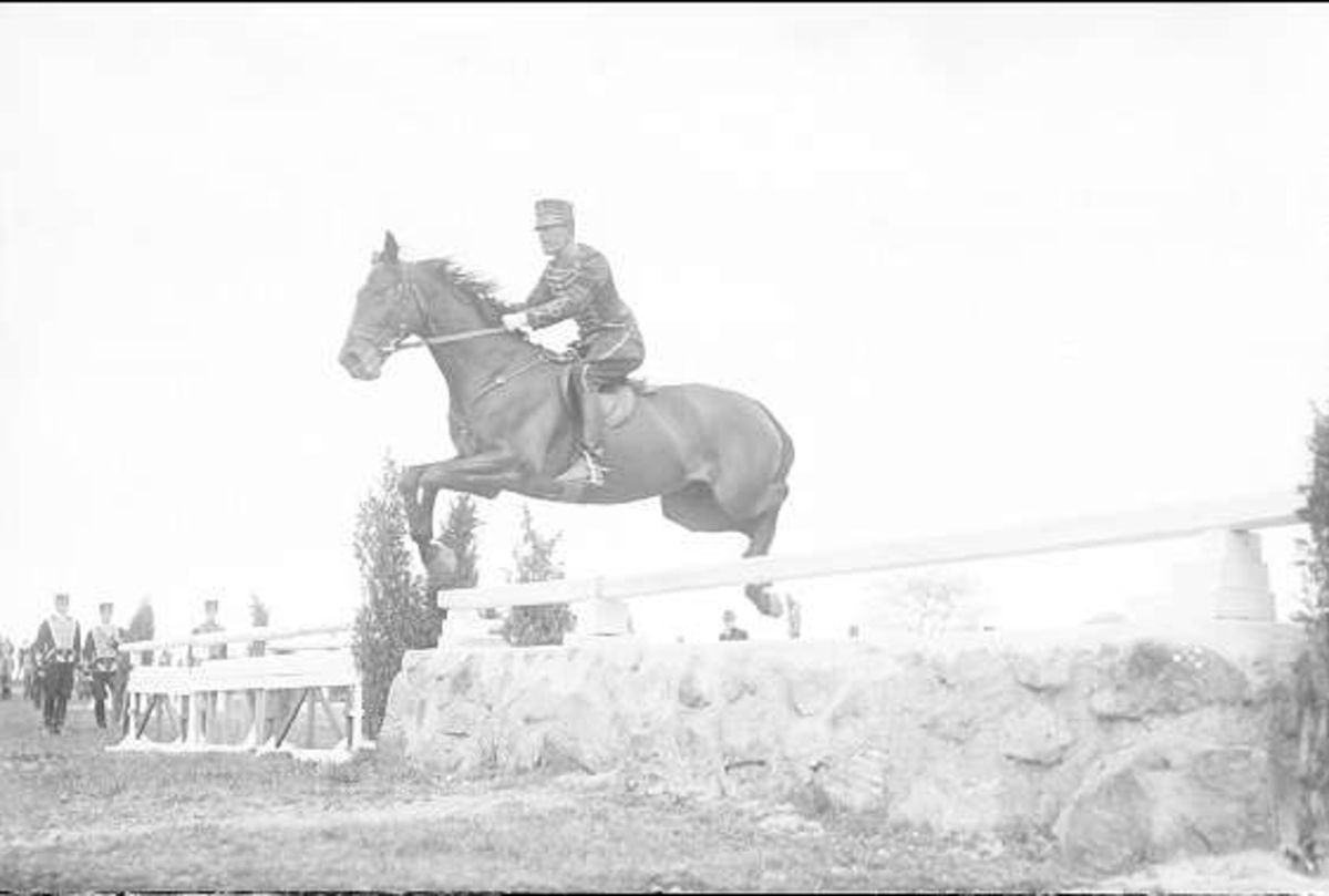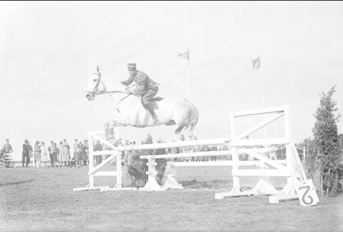 Regementskapplöpningar på fältet söder K 3 kasern. Jaktlopp för furirer passerar just över jordvallen öster I 9 kasernvakt. Närmast kameran furir Ragnar Seipel, senare fanjunkare K 3.