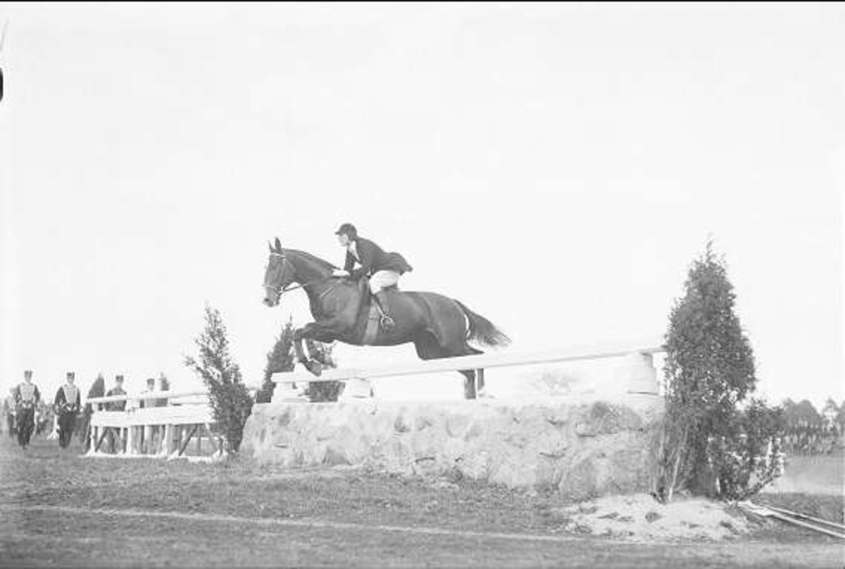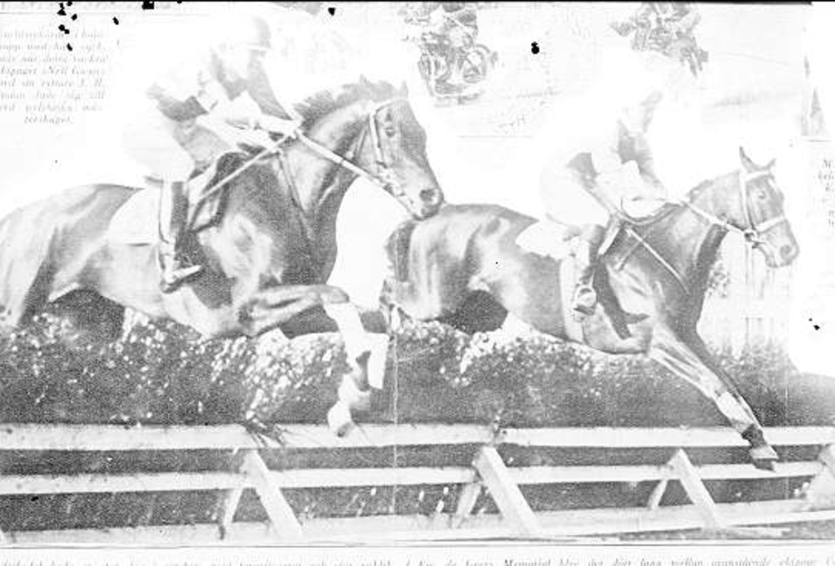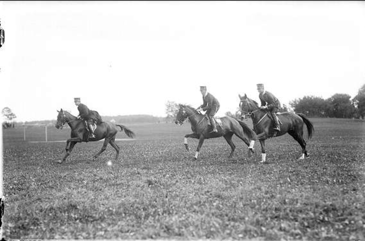 Regementskapplöpningar på fältet söder K 3 kasern. Jaktlöpning för officerare. Master är ryttm. Allan Ekman (mycket duktig steeplechareryttare) följd av löjtn. Gunnar (Putte) schildt och löjtn. Folke (Lot