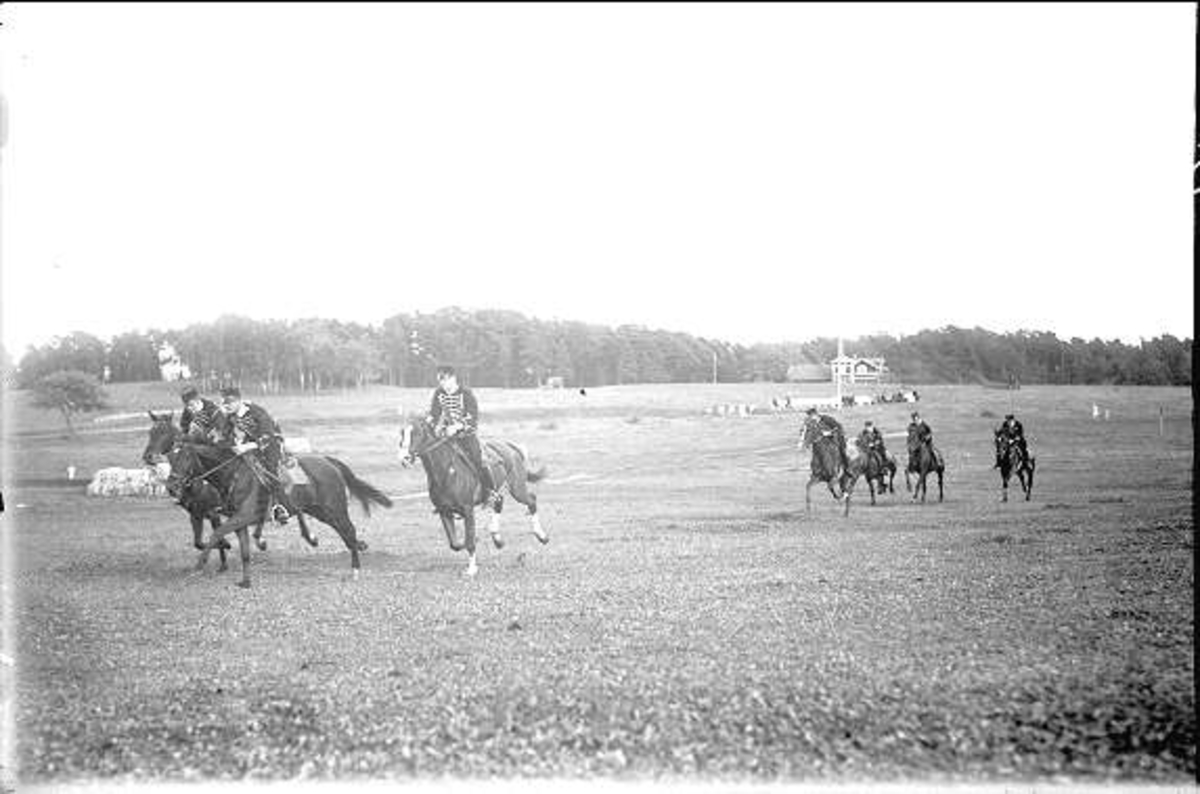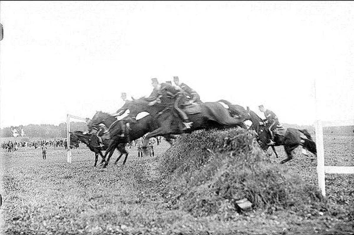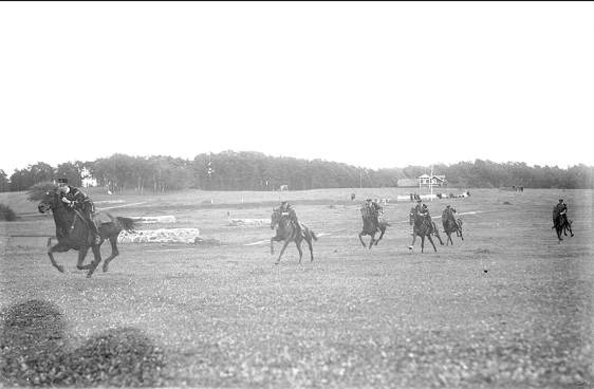 Regementskapplöpningar på fältet söder K 3 kasern. Jordvallen ute på fältet passeras.