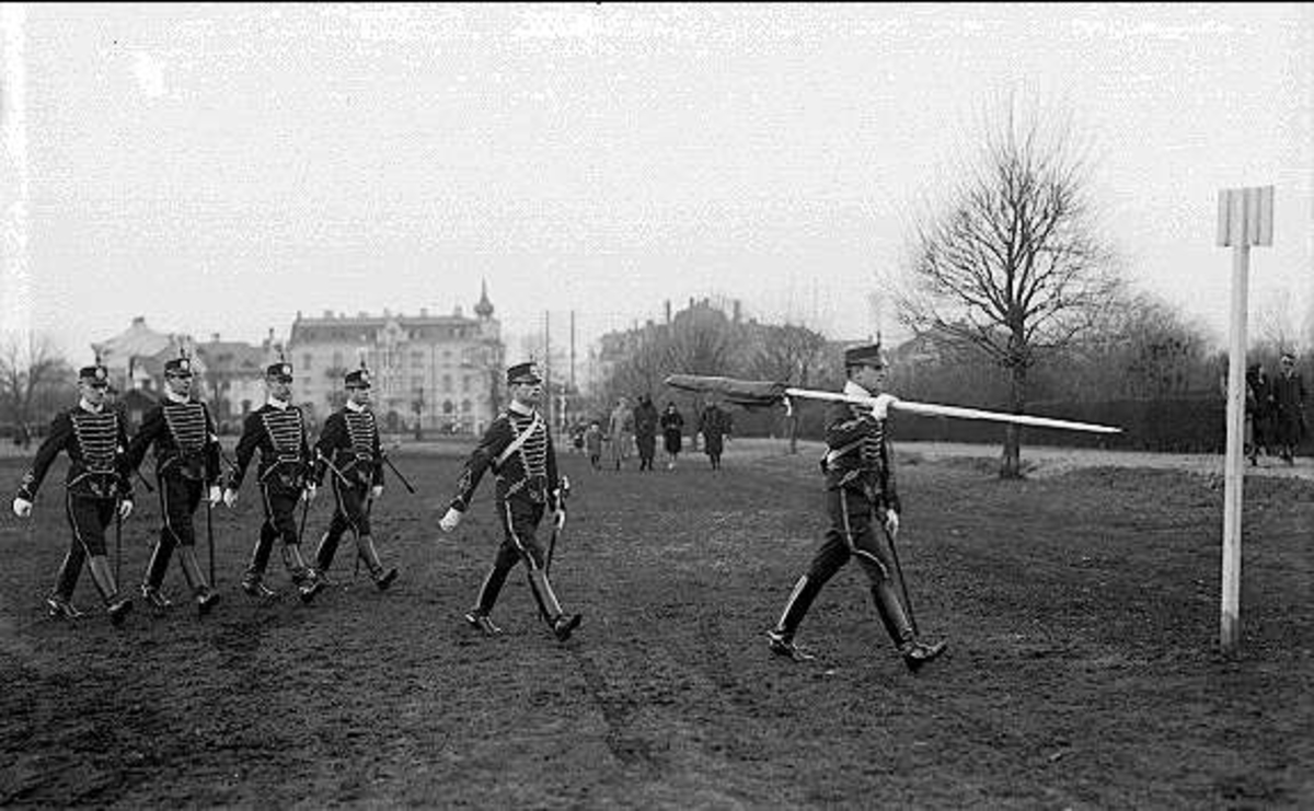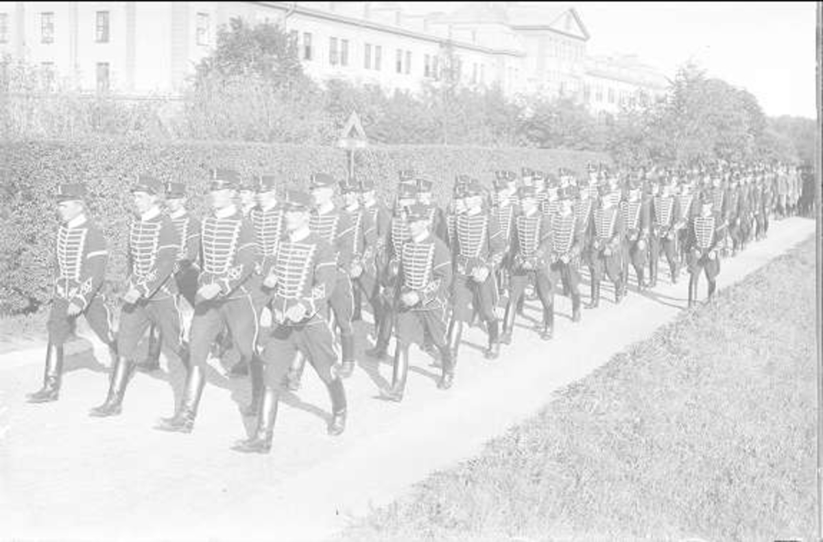 Regementet på vägen söder om K 3 kasern på marsch mot soldathemmet för gudstjänst. Soldaterna iförda uniform m/1895.