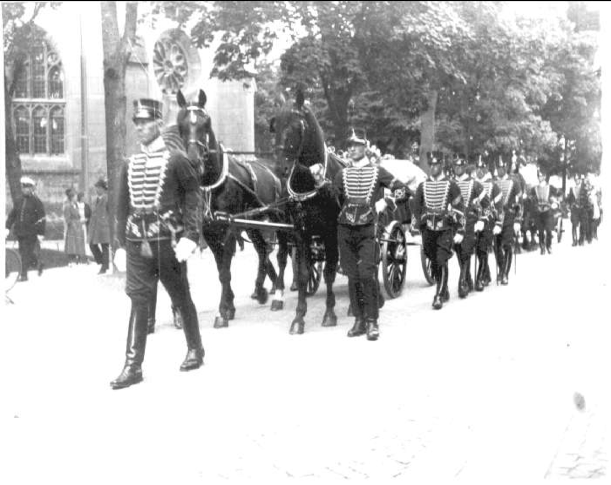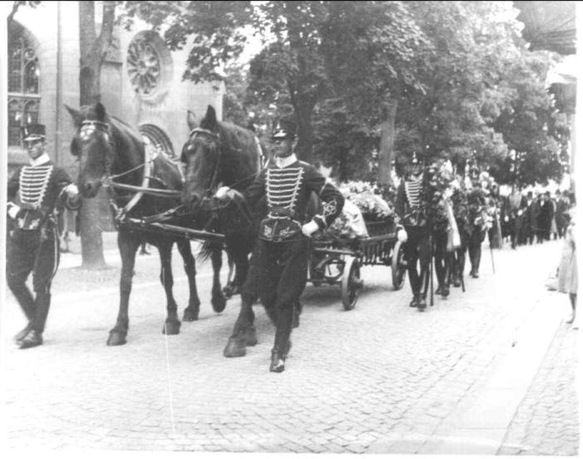 Överste C E Knös begravning 22/7 1936. Kistan buren av 8 st K 3 furirer på väg från kyrkan till katafalkvagnen.