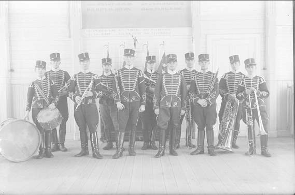 Den sista delen av K 3 musikkår som 1936 bestod av 16 musiker. Musikernas m/ä-uniform skilde sig från övriga genom beteckningen på bägge axlarna. Där fästes det så kallade "svalbot", observera mus