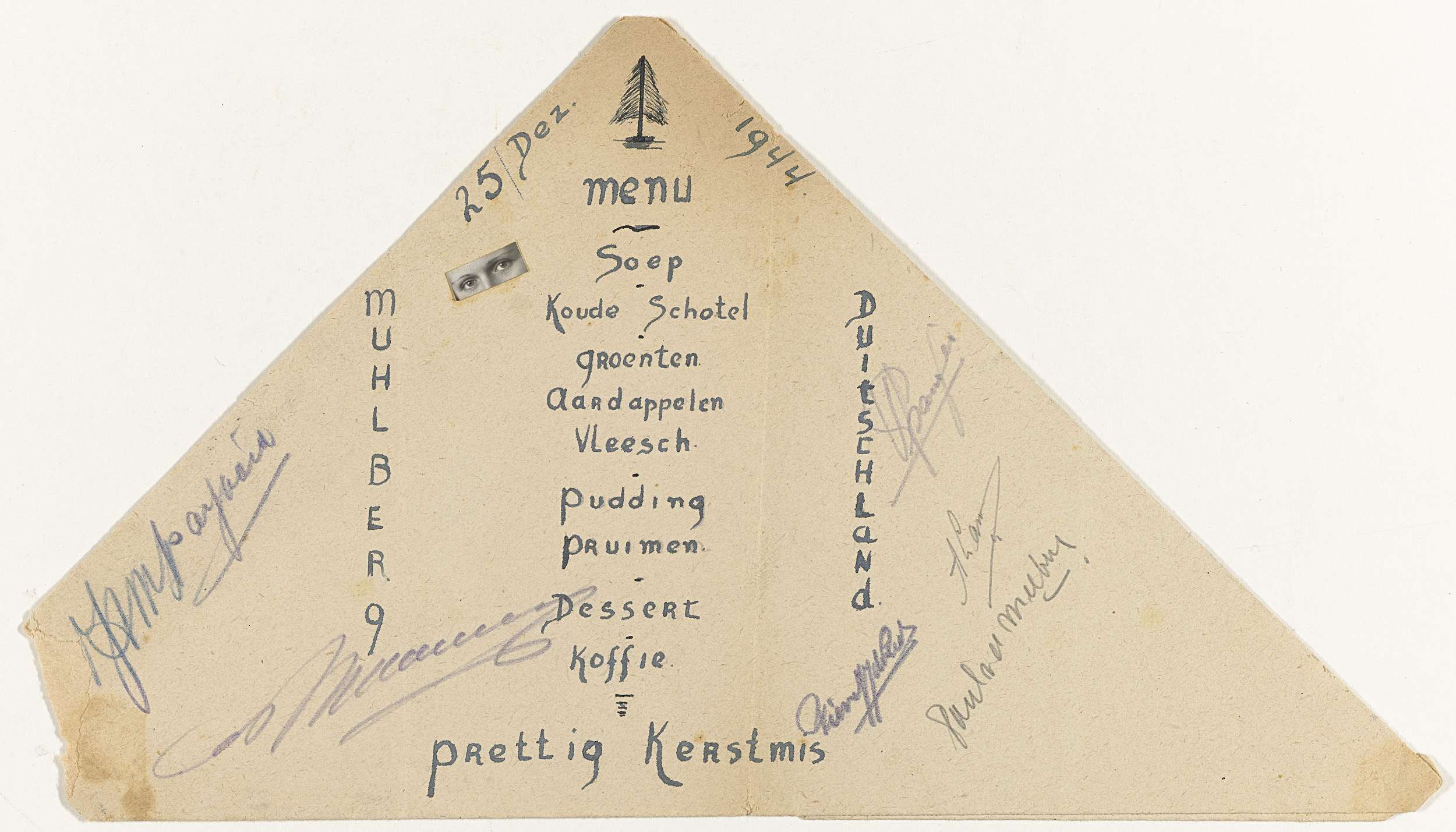 Kerstmenu, 25 december 1944, van een diner in het krijgsgevangenen kamp Stalag IV B in Mühlberg a/d Elbe uit het bezit van D. van Maarseveen