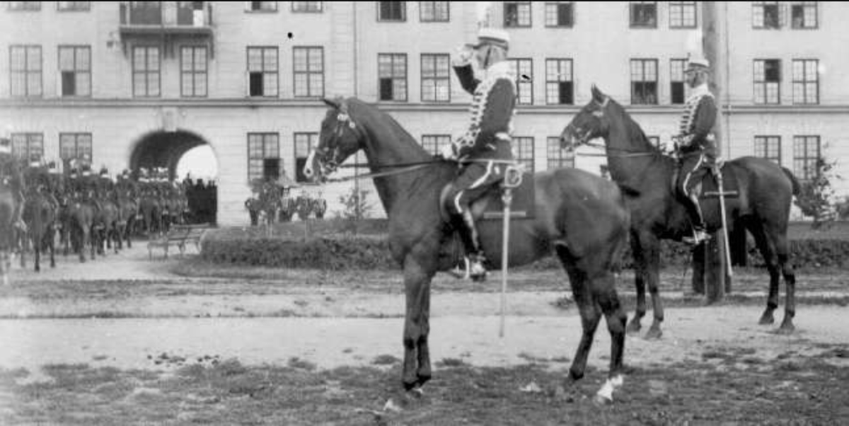 Regementet lämnas av, söder om kasern, till sekundchefen överste Rudenschiöld som passerar 5 skvadronen.