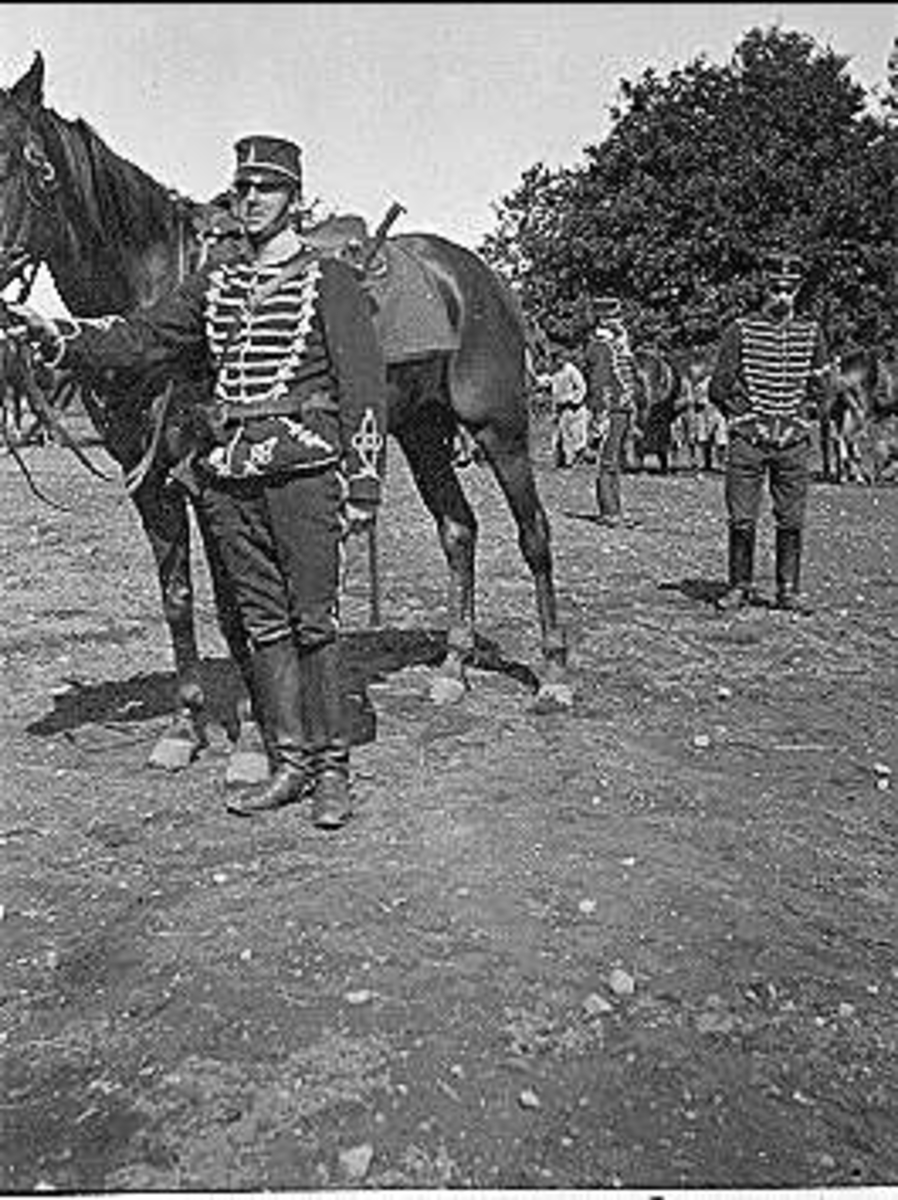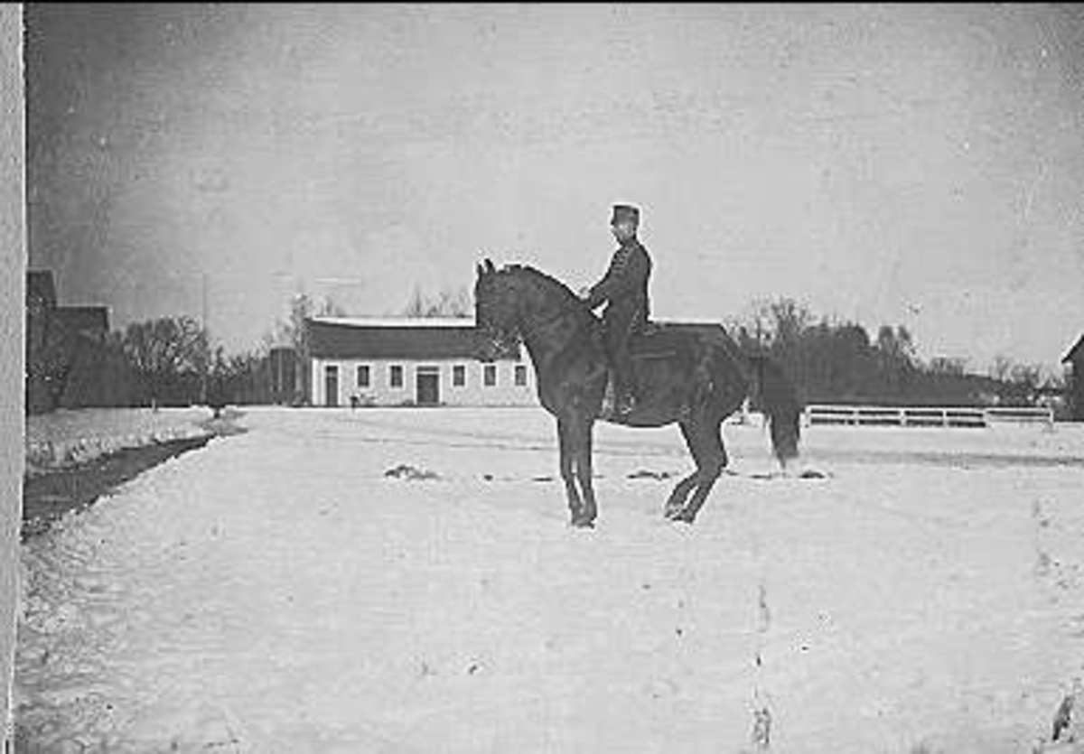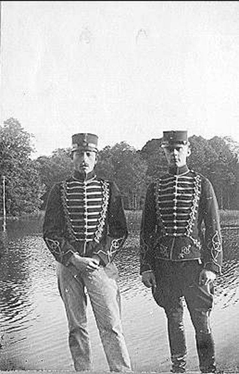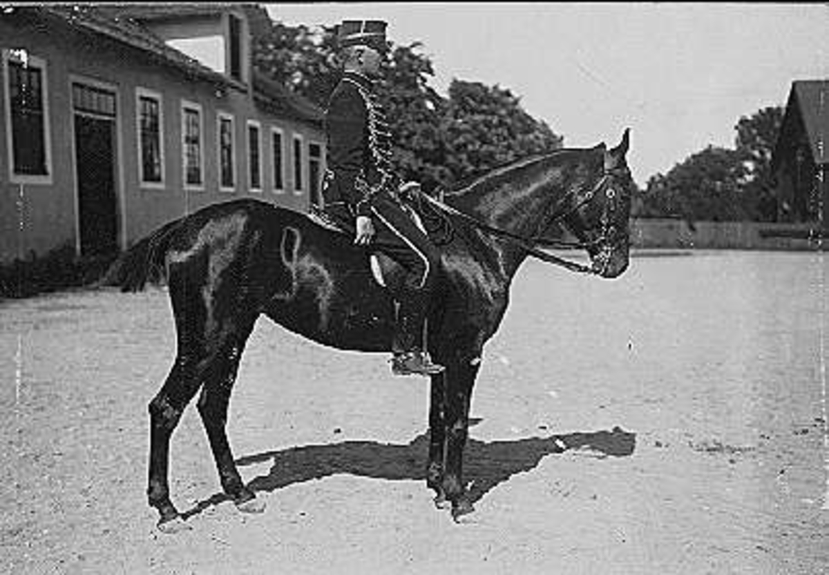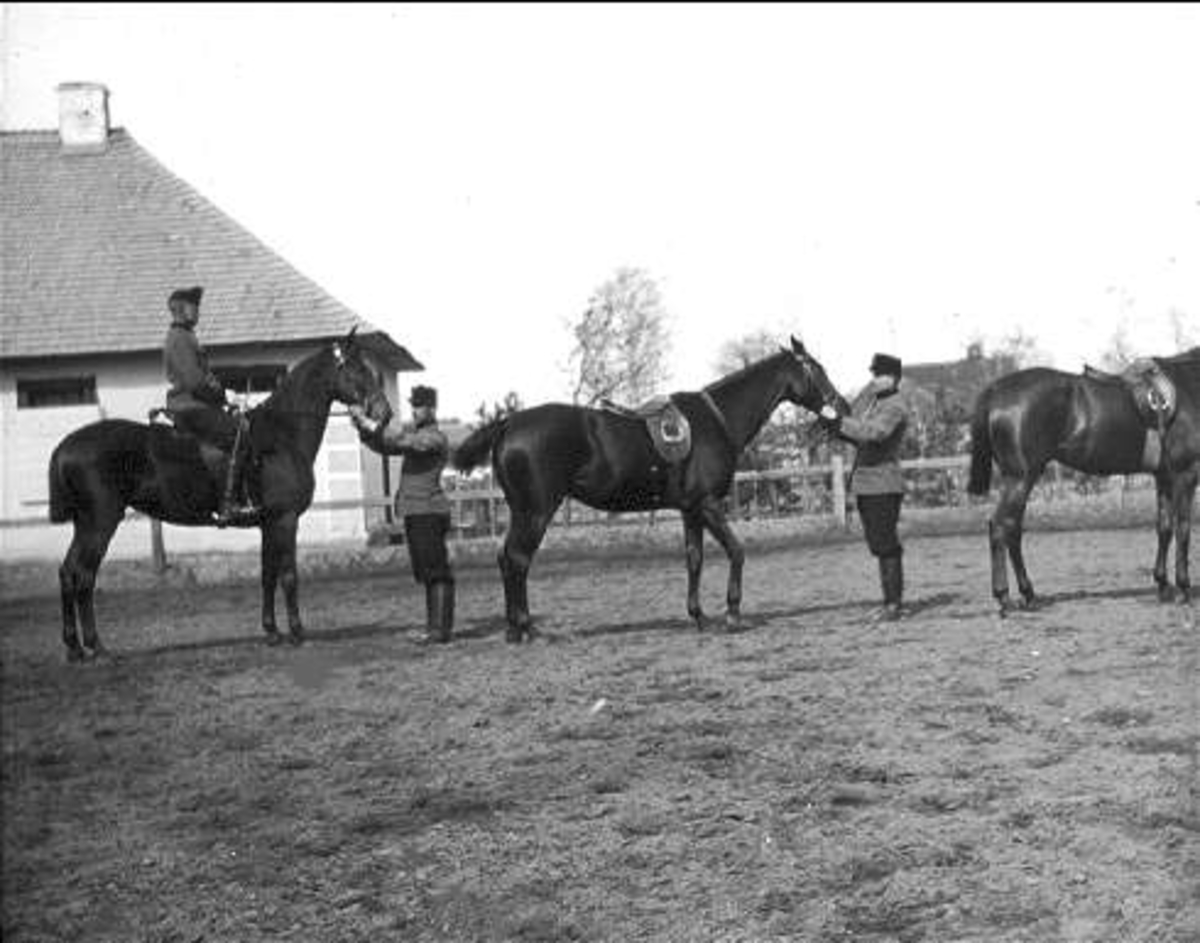 Kavalleriets fältövningar år 1905, 1906. Tolkryttare bakom vilken två husarer tolkade.