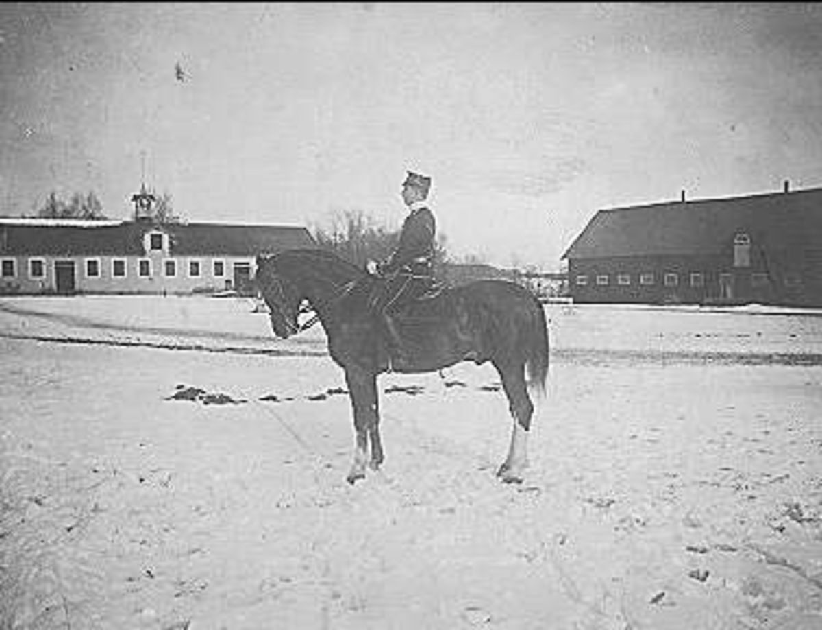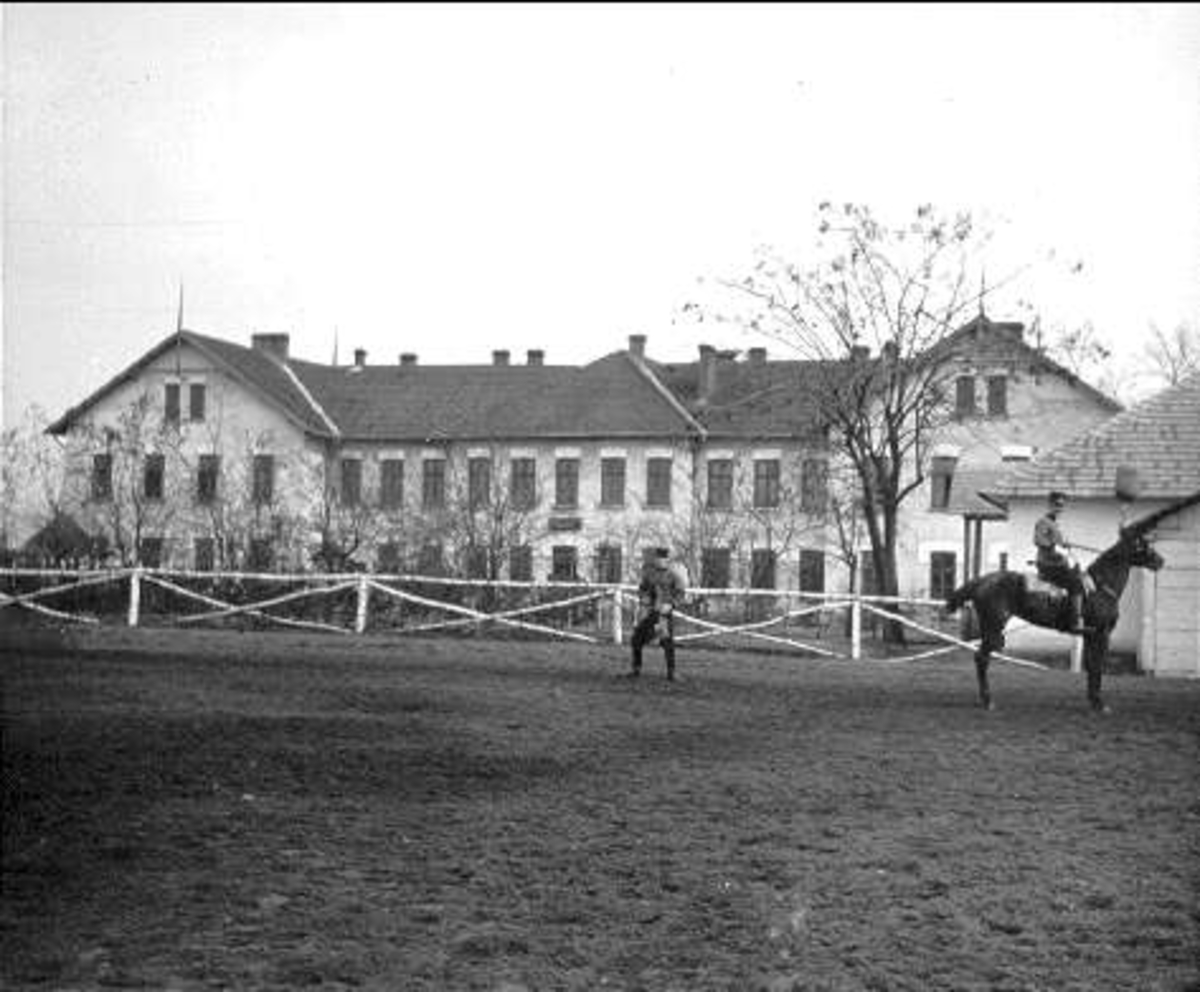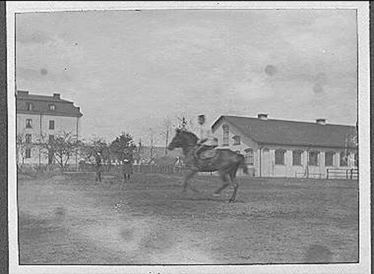 På ridplan med officersstallet till höger och Lilla ridhuset och vagnstallet till vänster.