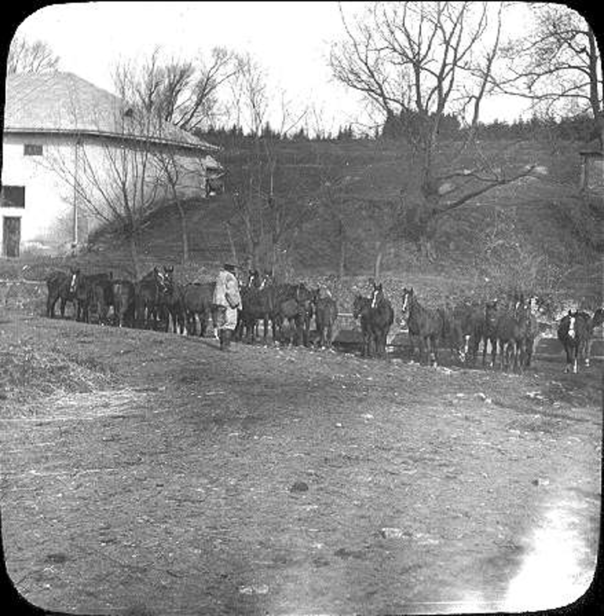Bilder från Horodenka, gods i östligaste Galizien. Unghästar vattnas.