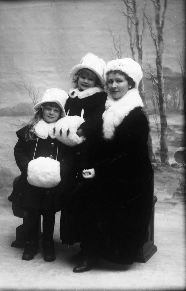 Ateljébild där en flicka är klädd till brud och två till hennes tärnor. Alla klädda i vita klänningar med påsydda, konstgjorda blommor. Bruden är klädd i sl&oum