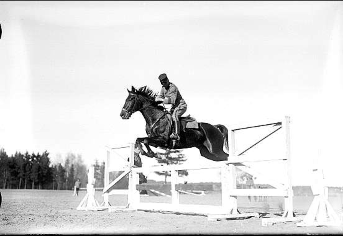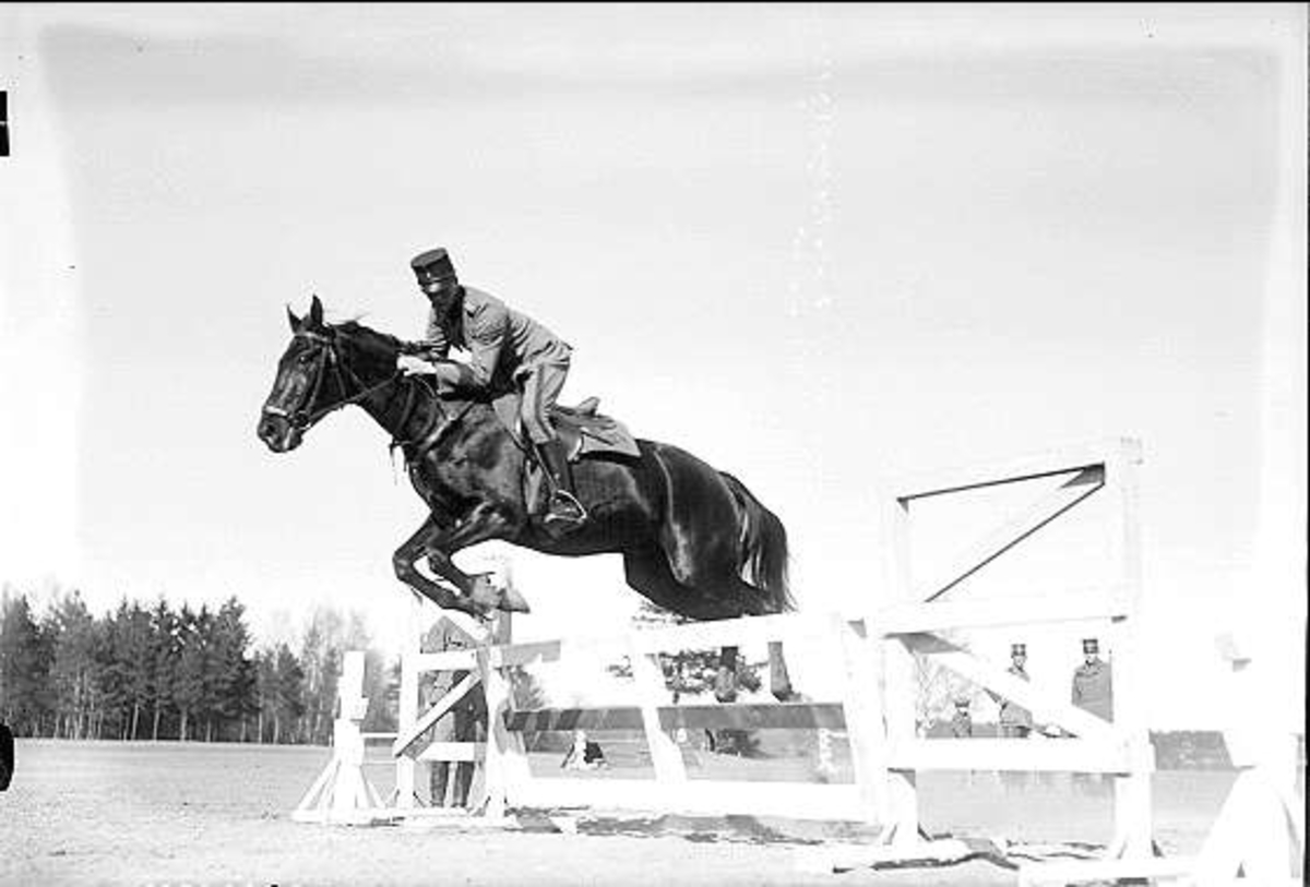 Träningshoppning på stenmuren på östra kaserngården. Furir i uniform m/10 och mössa m/1895.