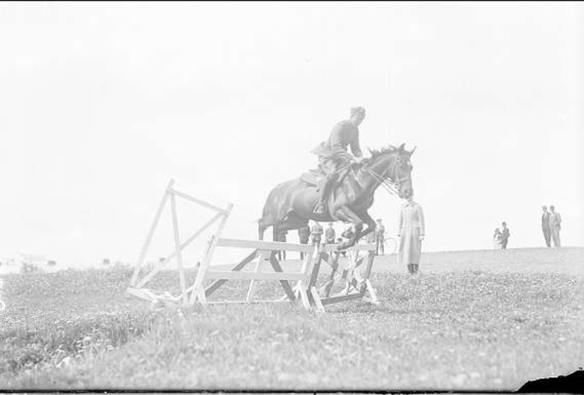 Skövde fältrittklubbs tävlingar 1929. Antagligen fälttävlans terrängritt i trakten av södra fältet (Sandfältet).