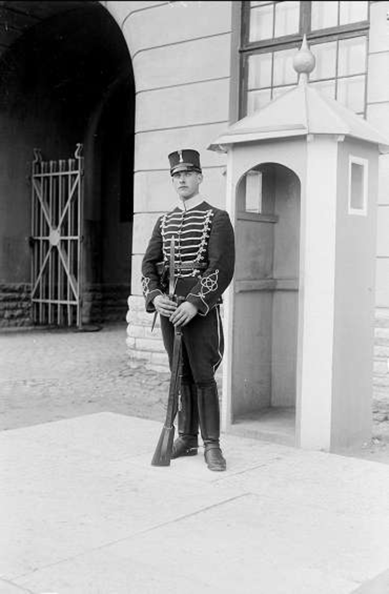 Livhusar i uniform m/1910, mössa m/1895 och benläder, utanför valvet vid K 3