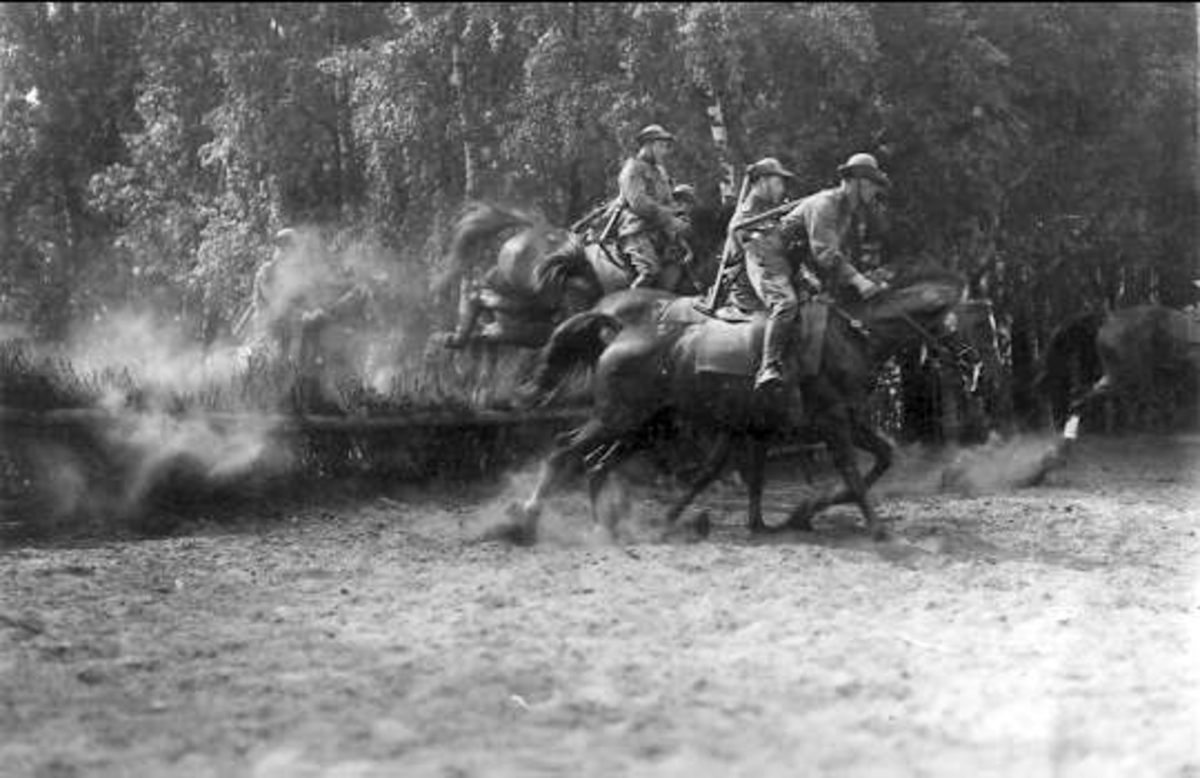 Utbildning med vpl till häst på södra fältet. Uniform m/10 med "trekantshatt".