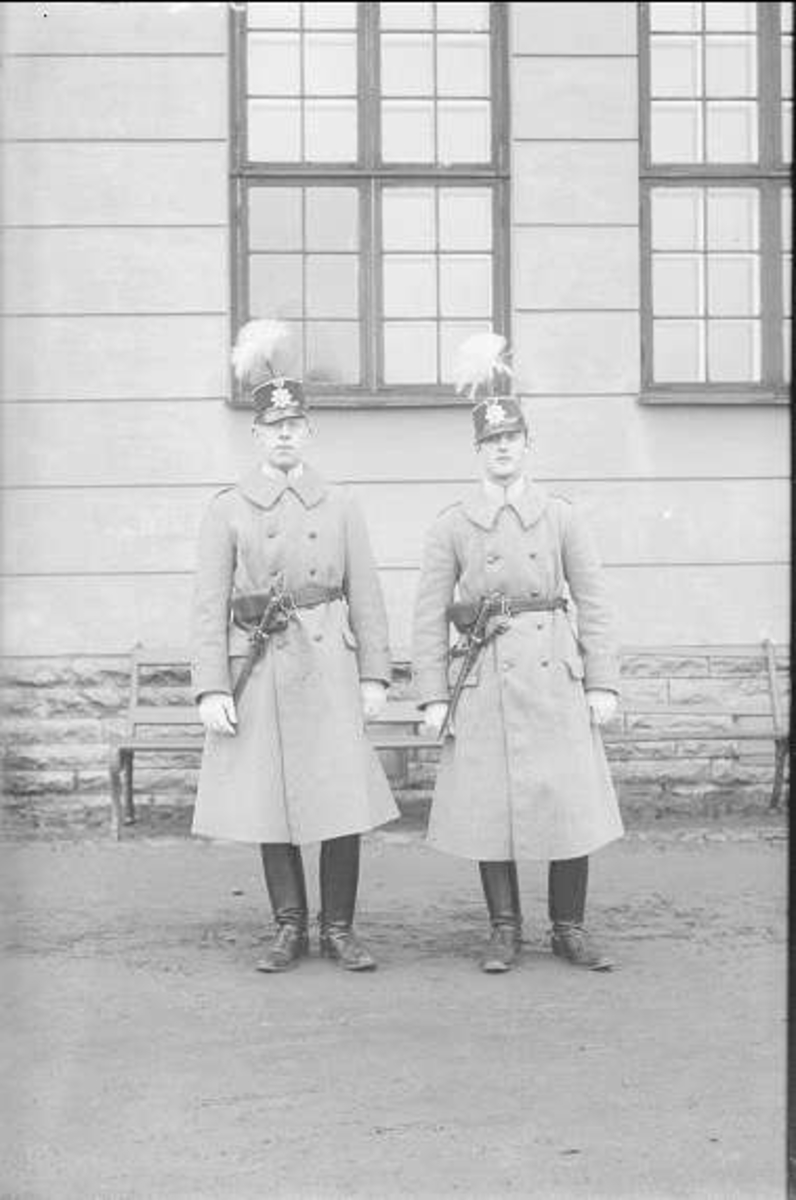 Två vaktmanskap utanför valvet K 3 kasern. Klädsel: Uniform m/ä, kappa m/10 och mössa m /1853 med plym.