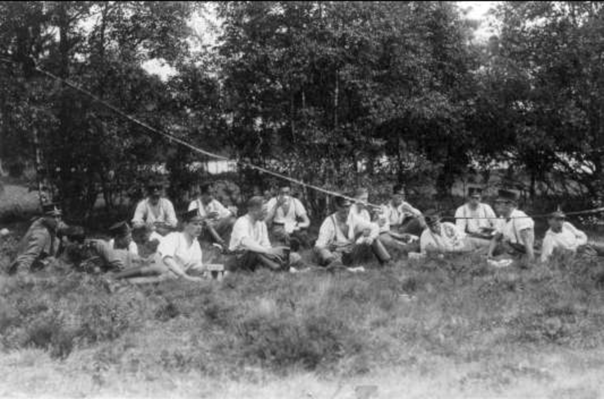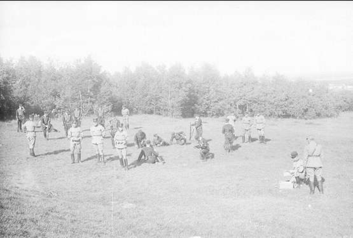 Skjututbildning med 4. skv på skjutbanan nedanför Alphyddan (Billingehus). Ett befäl i m/23, truppen i m/ä och m/10. De i m/10 hade mössa m/ä.