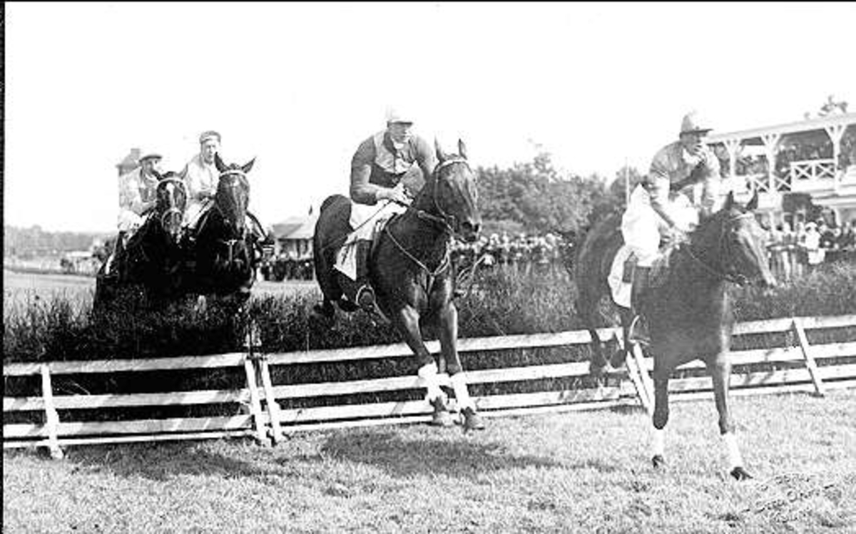 Regementskapplöpningar på fältet söder K 3 kasern. Jaktlöpning för officerare. Master är ryttm. Allan Ekman (mycket duktig steeplechareryttare) följd av löjtn. Gunnar (Putte) schildt och löjtn. Folke (Lot