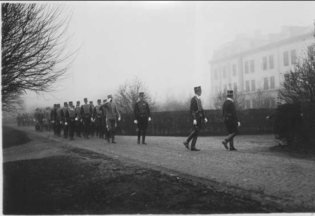 Regementet på vägen söder om K 3 kasern på marsch mot soldathemmet för gudstjänst. Soldaterna iförda uniform m/1895.