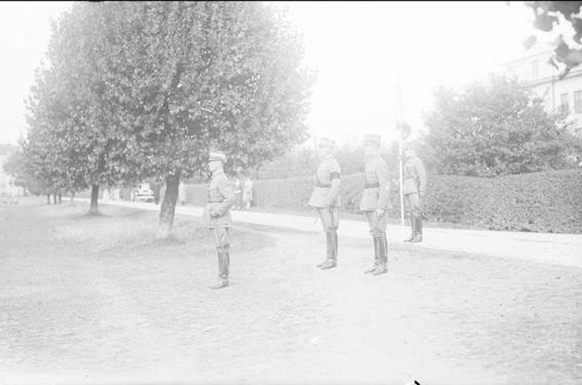 Kasernvakten avlämnas 4 dec. 1930 till kavalleriinspektören generalmajor R M von rosen. Med ryggen mot kameran i grå kappa övlt. Carl Trägårdh kasernofficer vid K 3.