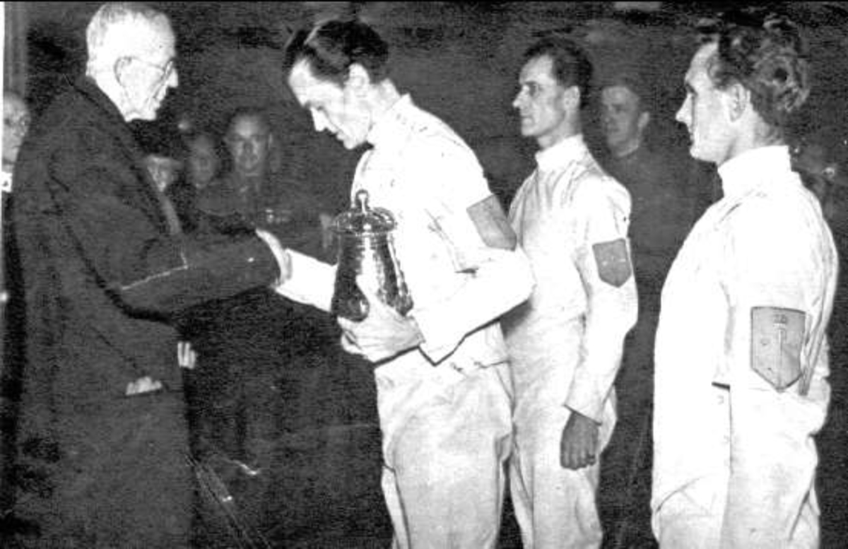 Chefen aspirantskolan 1939-40 löjtnant Stig Roempke på Courbette söder om livskvadrons stall i vilket aspirantskolan hade sina hästar uppstallade.