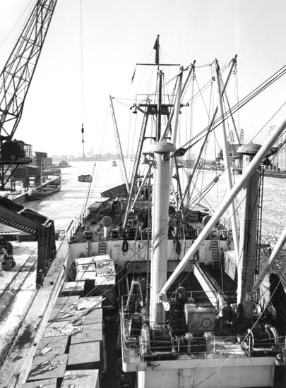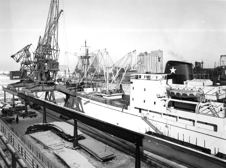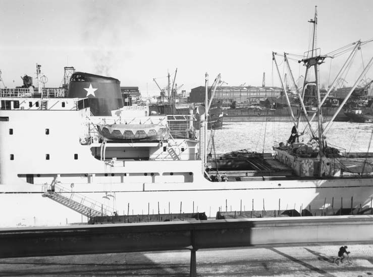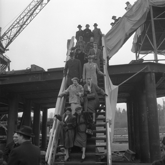 Dop och sjösättning av fartyget 131 M/T Bellami. Från vänster Uddevallavarvets dåvarande VD Helge Hagelin, bredvid honom skeppsredaren och varvets grundare Gustaf B. Thordén.