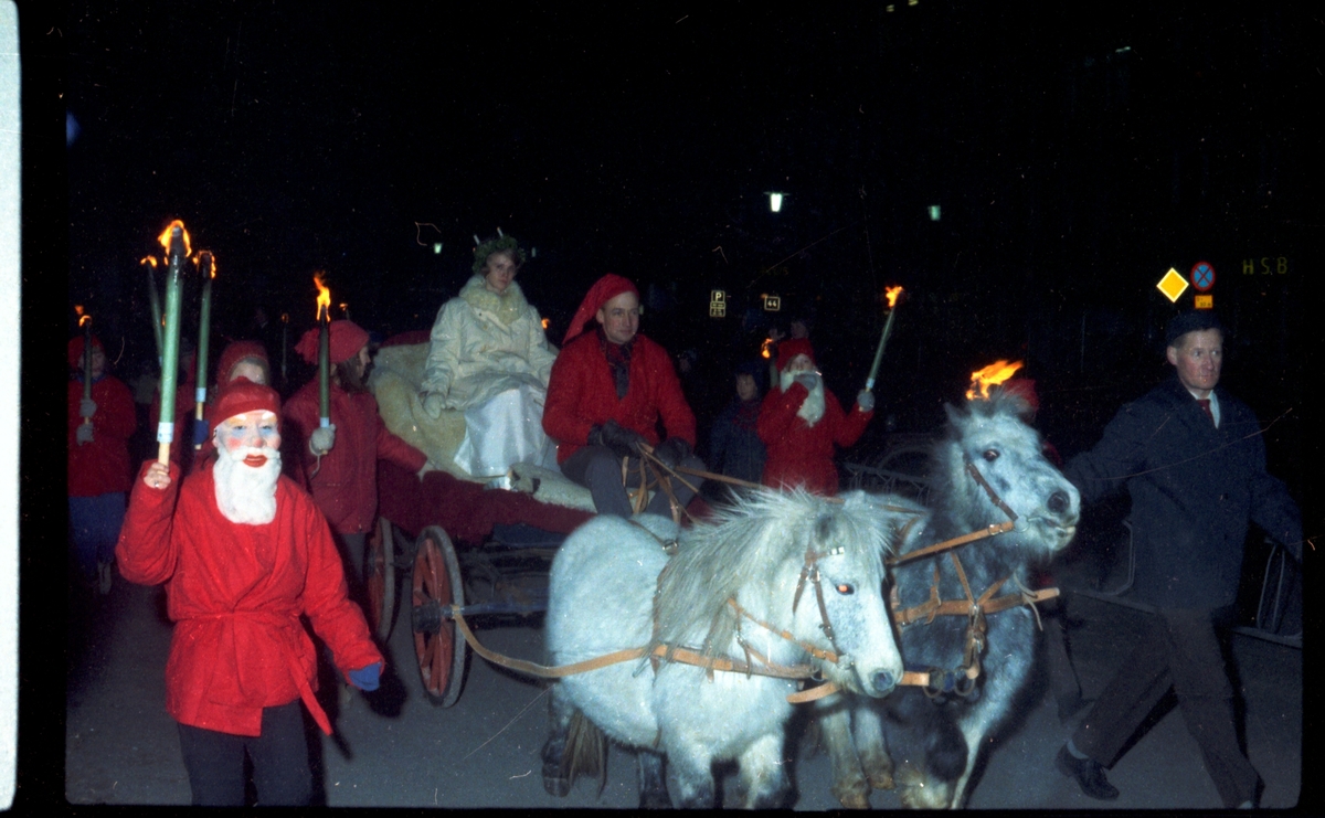 Göran Eriksson kröner Vänersborgs Lucia i aulan, Huvudnässkolan. Bilder från aulan samt kortegen på stans gator.
