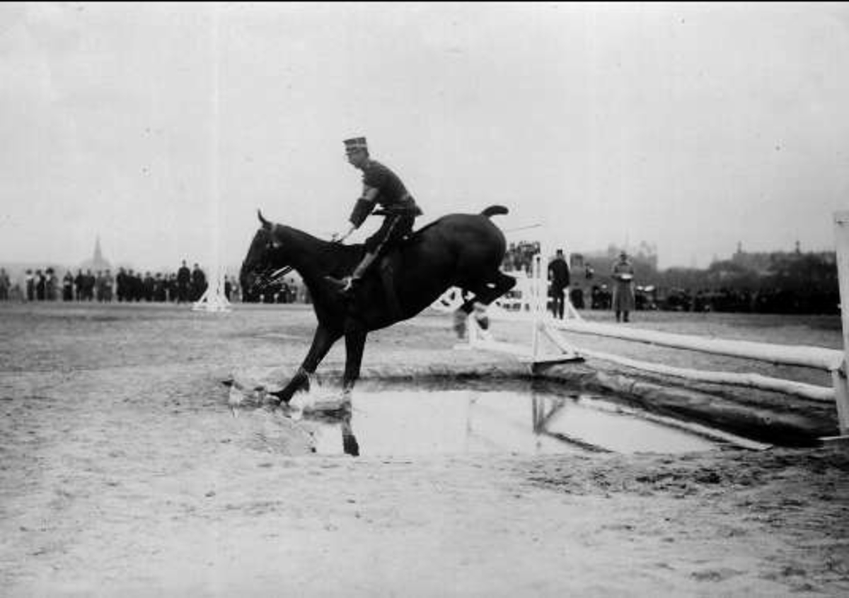 1. årseleverna på Strömsholmskursen på tävlingsresa till Stockholms fältrittklubbs tävlingar på Gärdet i Stockholm. Strömsholm 1910-11.