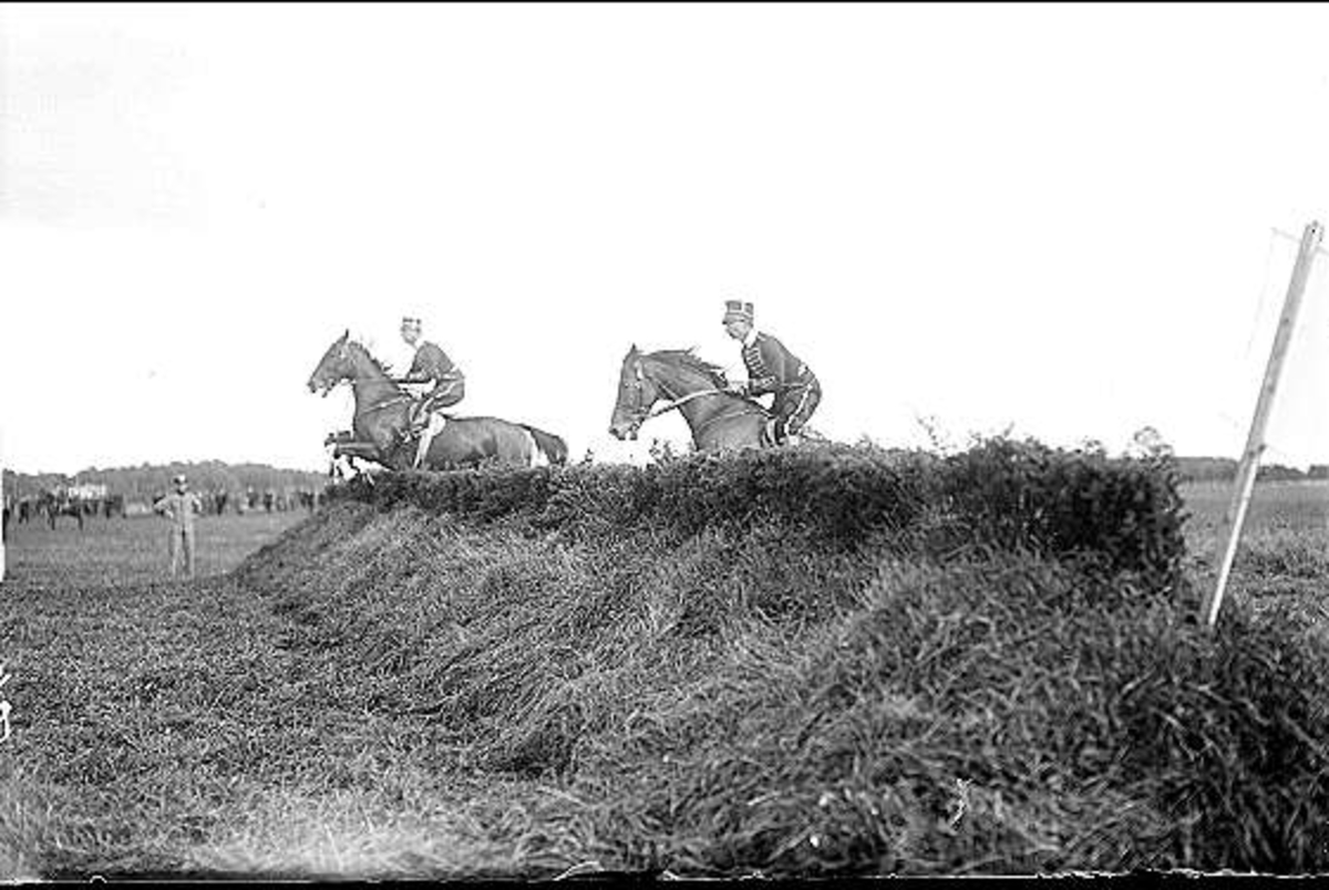 Regementskapplöpningarna 1928 på fältet söder K 3 kasern. Över jordvallen i olika stil. Ryttaren till vänster för tidigt avsprång - det gäller att "vara med". Ryttaren till höger för sent