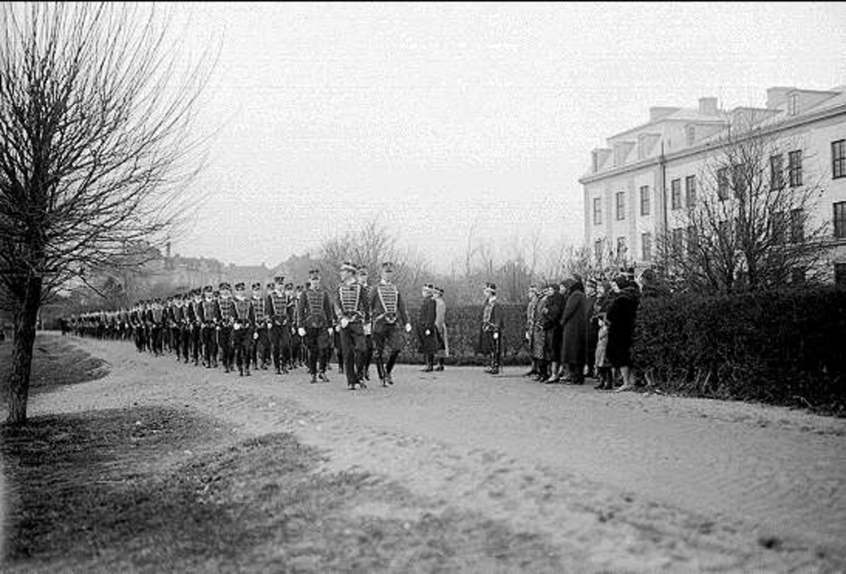 Förbimarsch söder valvet K3 kasern efter 4.decemberhögtidlighållandet i soldathemmet.