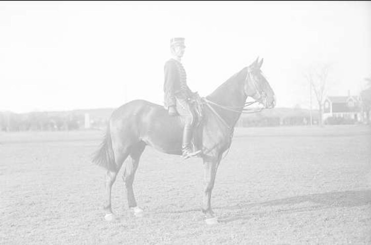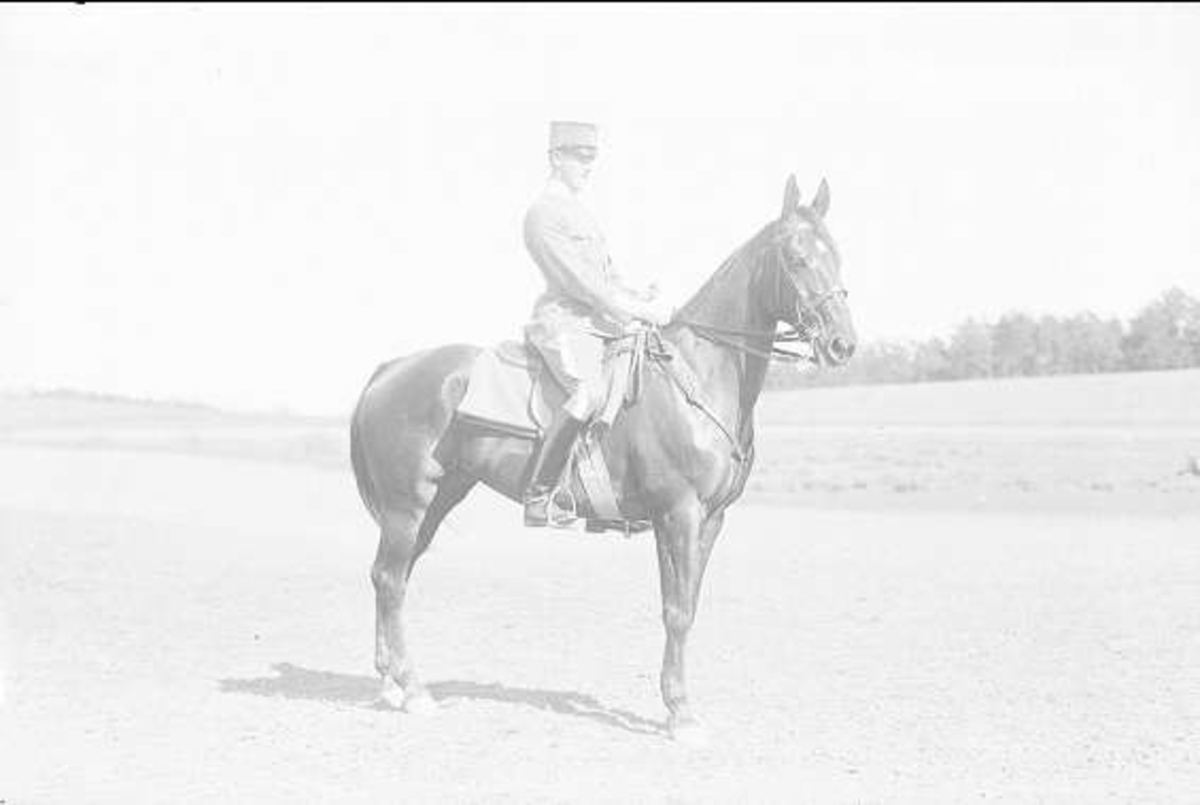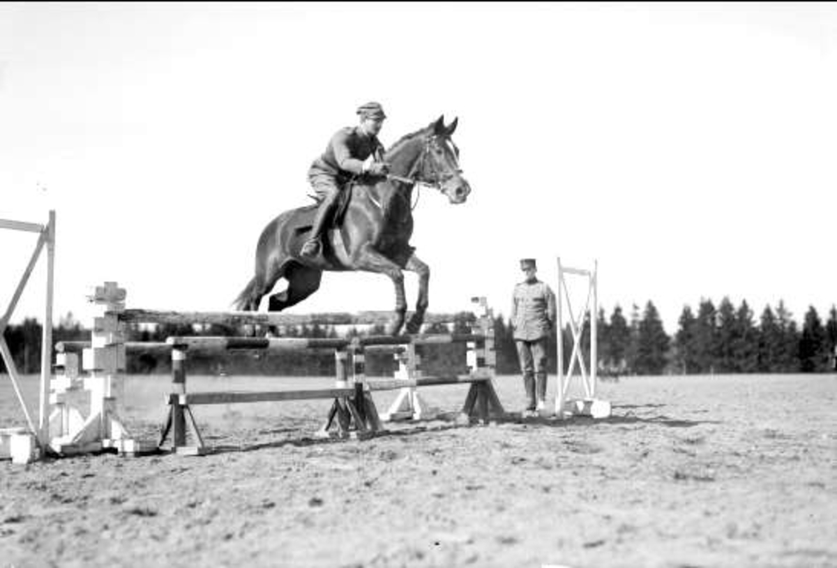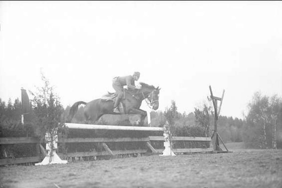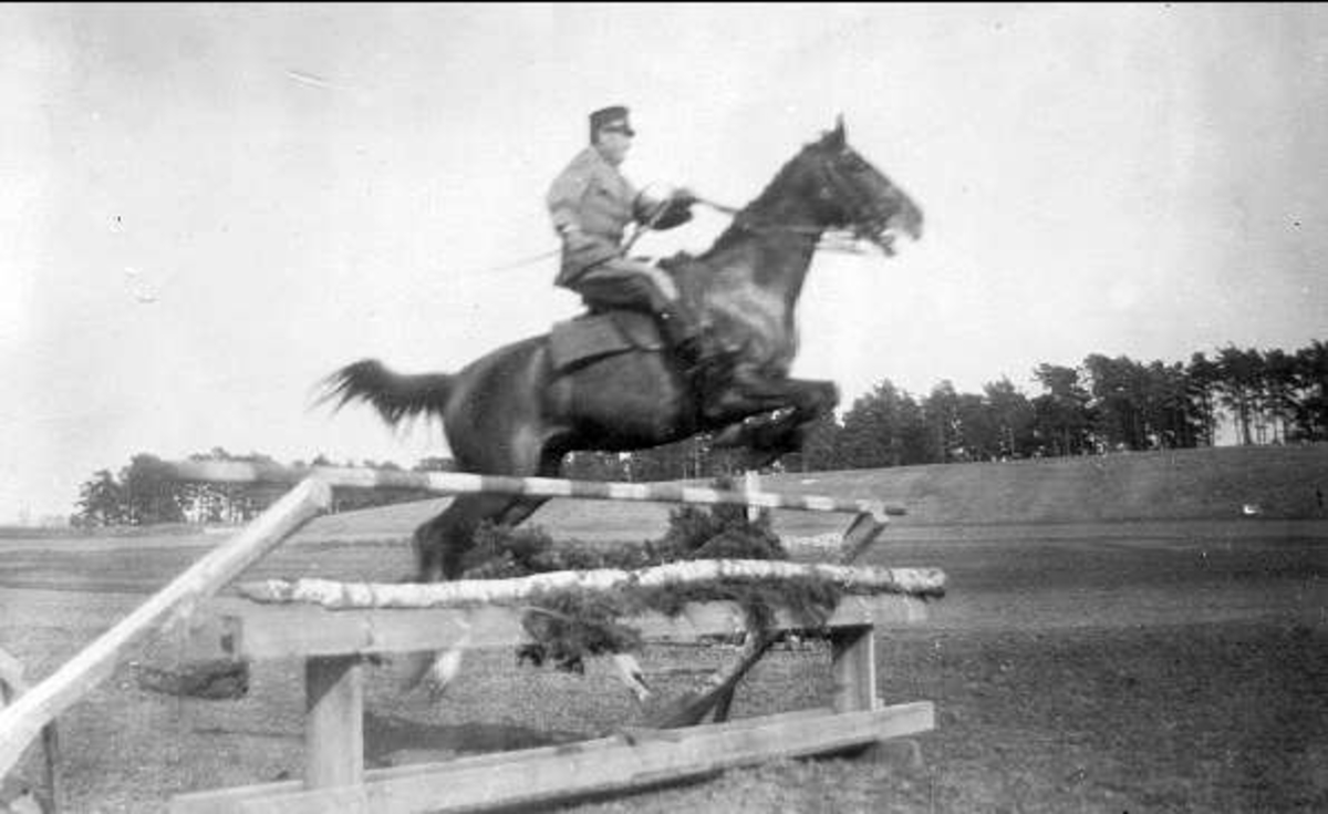 En av ryttmästare Harald Strömfelts tävlingshästar här riden en av regementets sergeanter. Hästen är antagligen Mackintosh (1917-38). Båda deltog i olympiaden i Berlin 1936.
