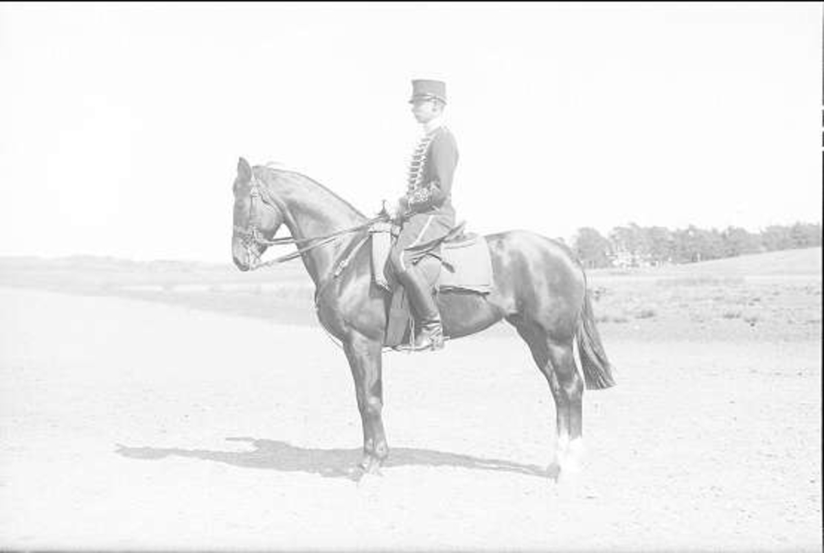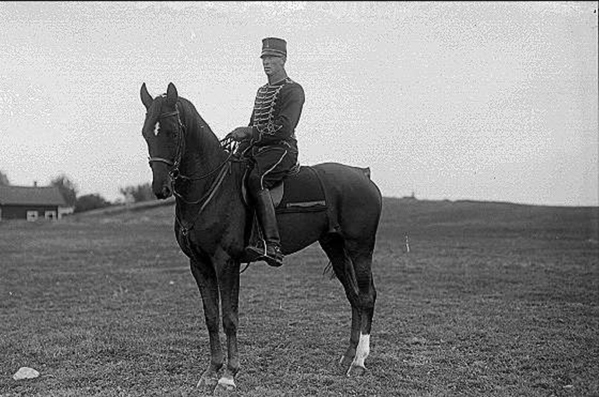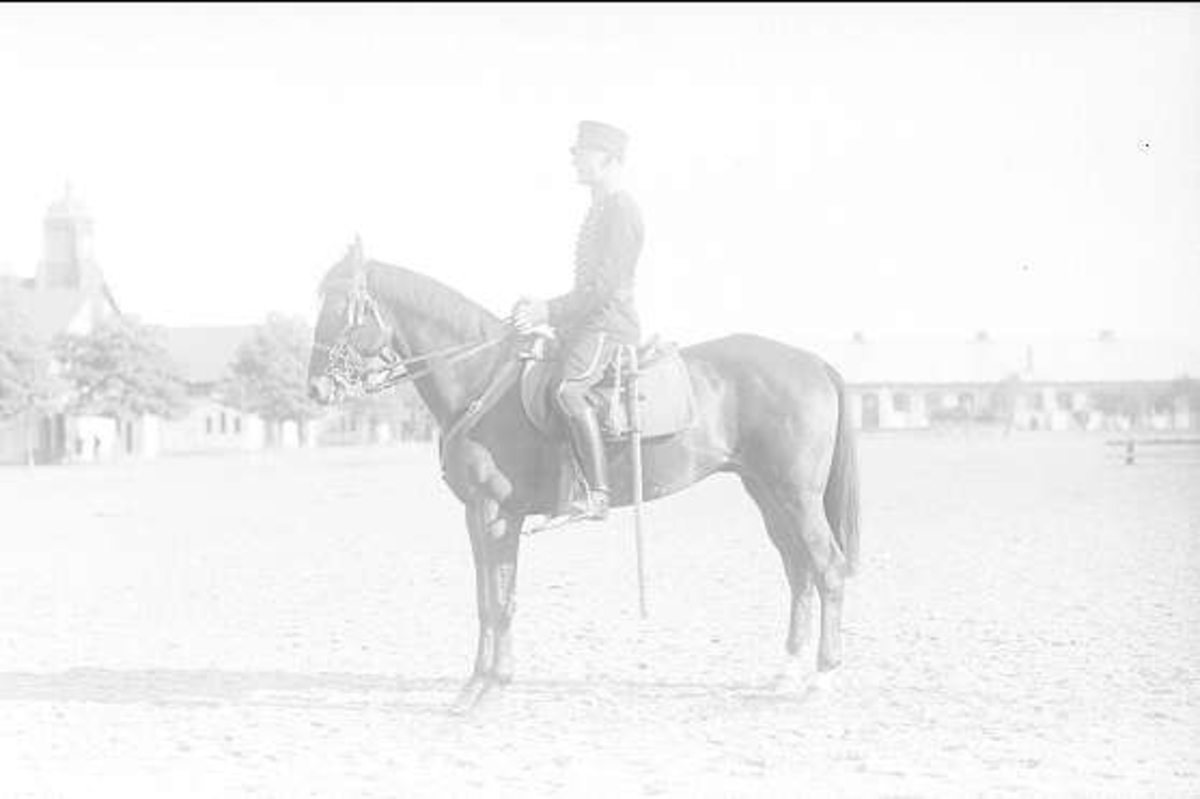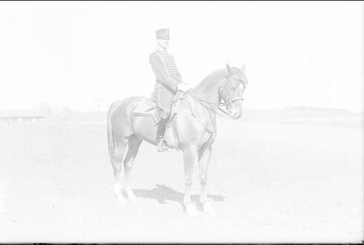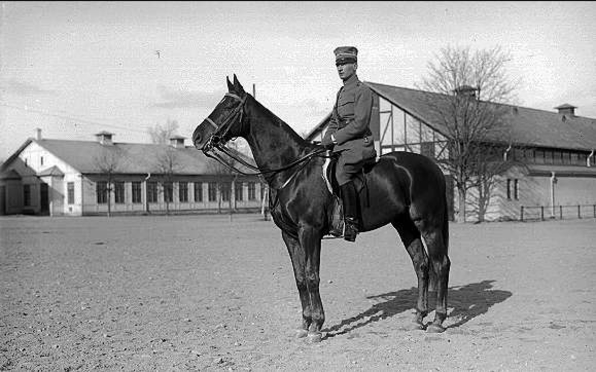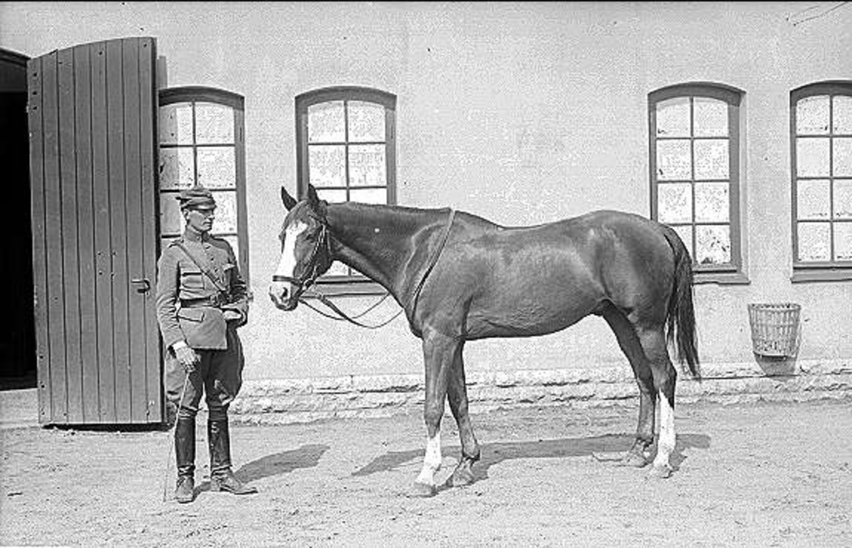 En av ryttmästare Harald Strömfelts tävlingshästar här riden en av regementets sergeanter. Hästen är antagligen Mackintosh (1917-38). Båda deltog i olympiaden i Berlin 1936.