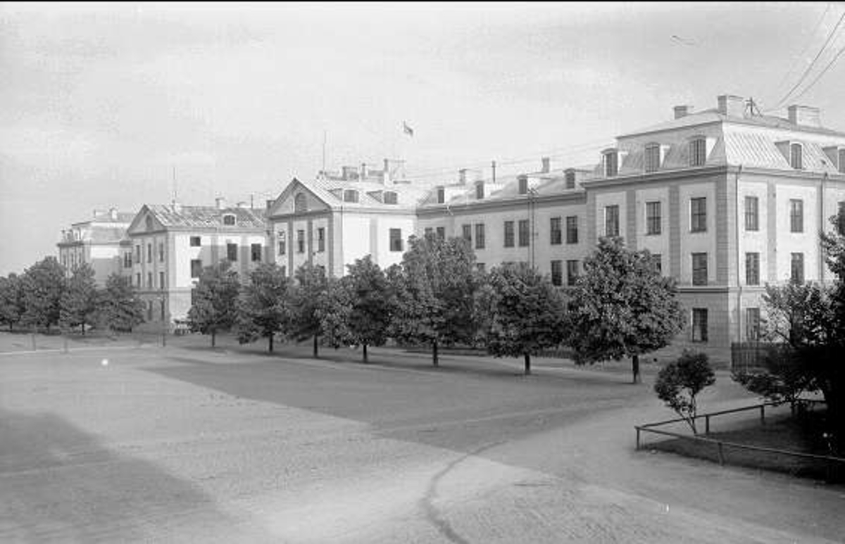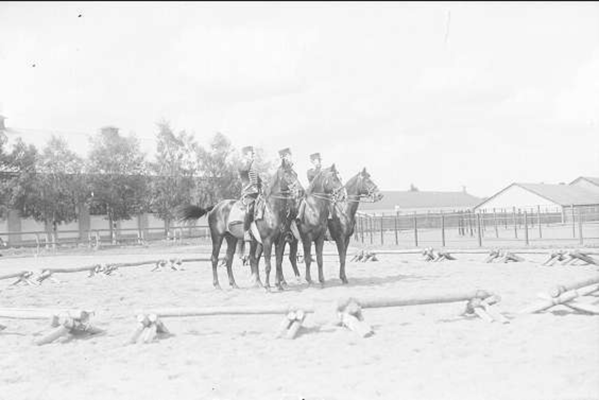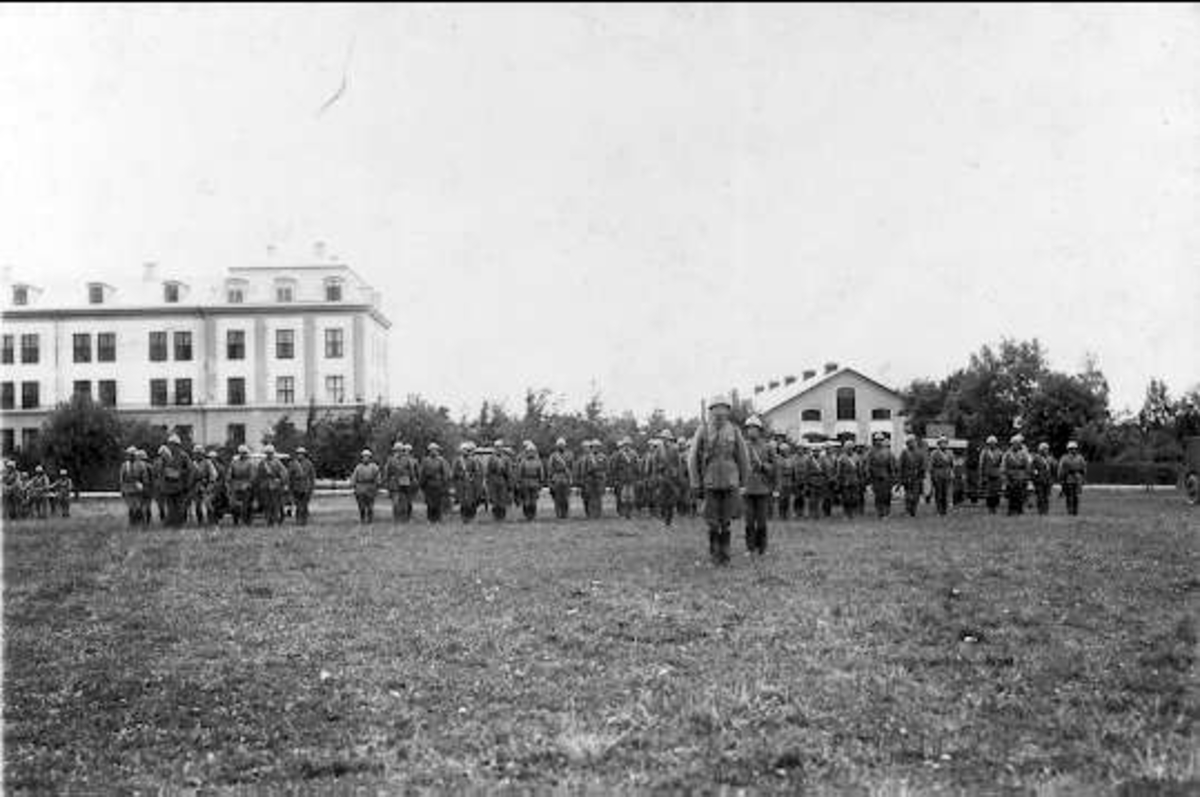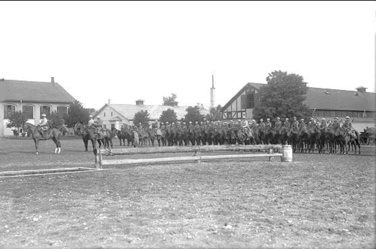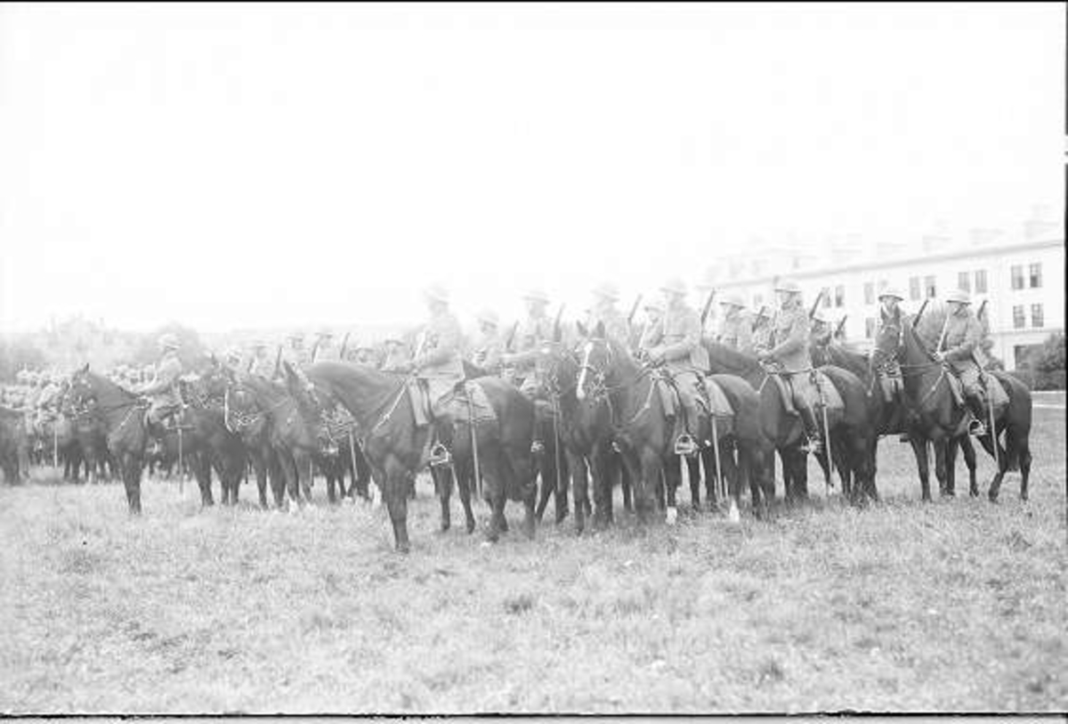 Livskvadron till häst uppställd på kaserngården söder om stallarna för avlämning före fälttjänstövning 1930. Avbildad trupp skall ingå i övningens B-styrka, de har vitt band runt hjä
