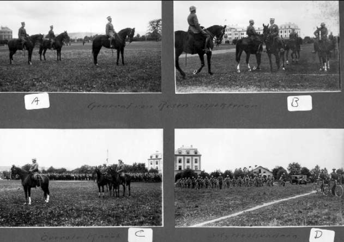 Bild: A-B. General von Rosen inspekterar K3. Bild: C. Överste Knös framför regementet. Bild: D. Cykelskytteskvadron.