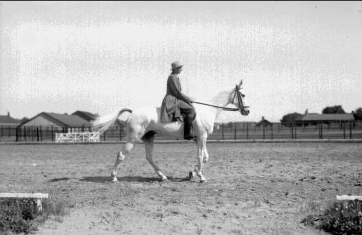 Ingrid von Essen, född Roos 1896, maka till ryttmästare Peter von Essen, K 3, sedermera chef för Gudhems remontdepå. Marschall- Mackensen, skimmel importerad från distriktet Marieburg, född 1922 A Mameluck-Mantel, var ryttm