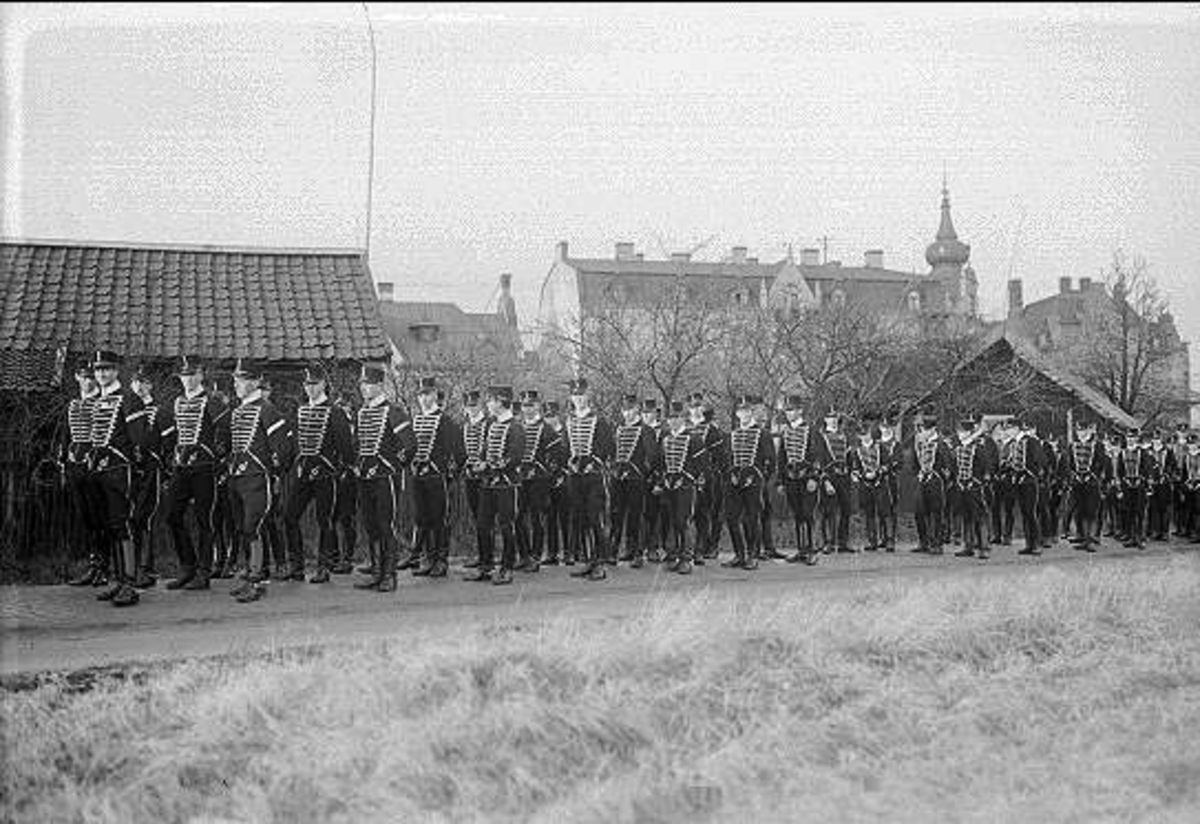 Fru Sigrid Focks (maka till dåvarande K 3 löjtnanten Hans Fock) begravning maj 1930 i Skövde kyrka. Kistan bärs av elever i Hans Focks furirskola.
