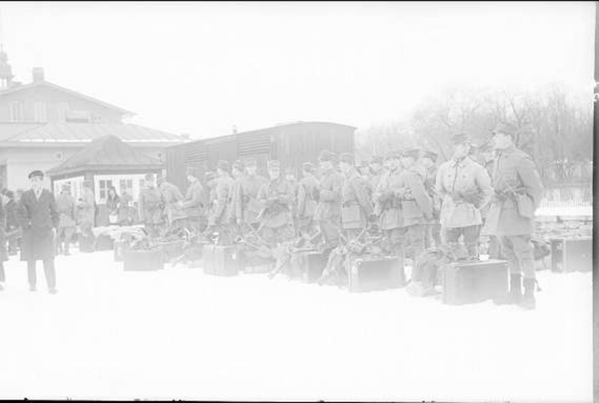 Avfärd för kavalleriofficersaspirantskolan till vinterutbildning. Ilastning på Skövde järnvägsstation.