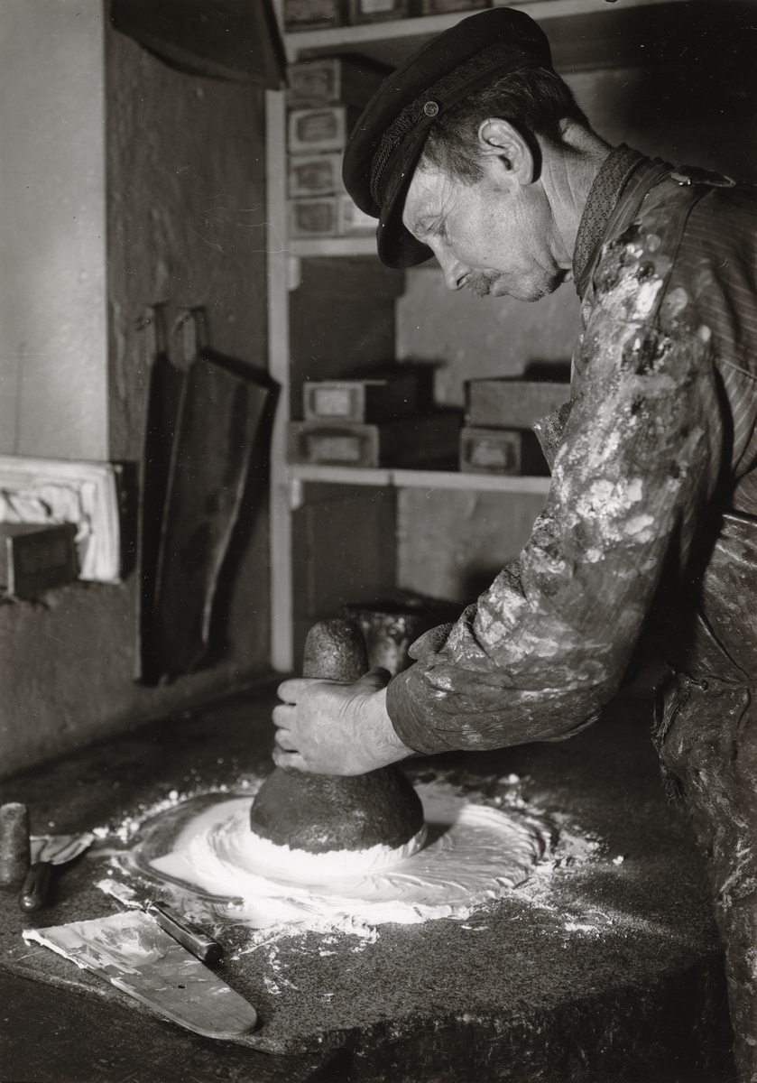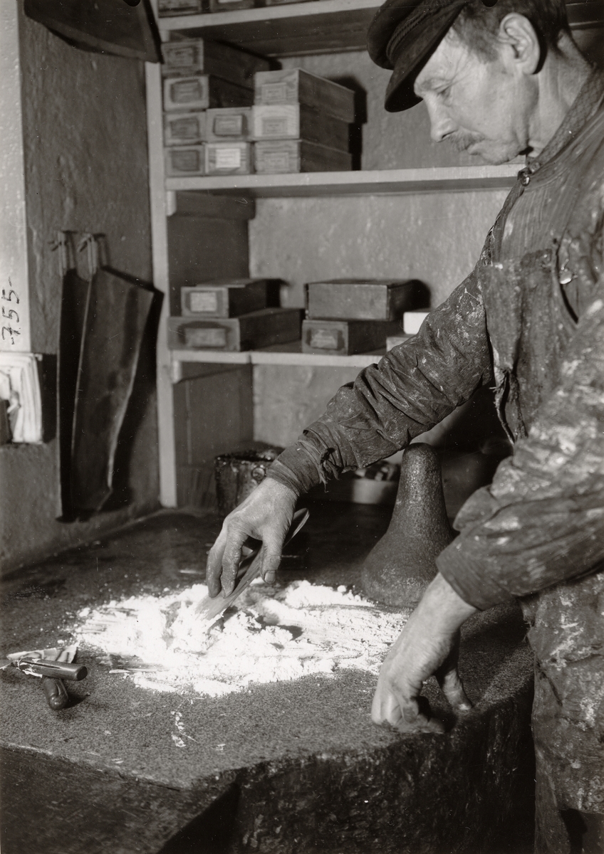 Rivning av tubfärgerna enligt 1890-talsmetoder. Rivning med löpare av granit.