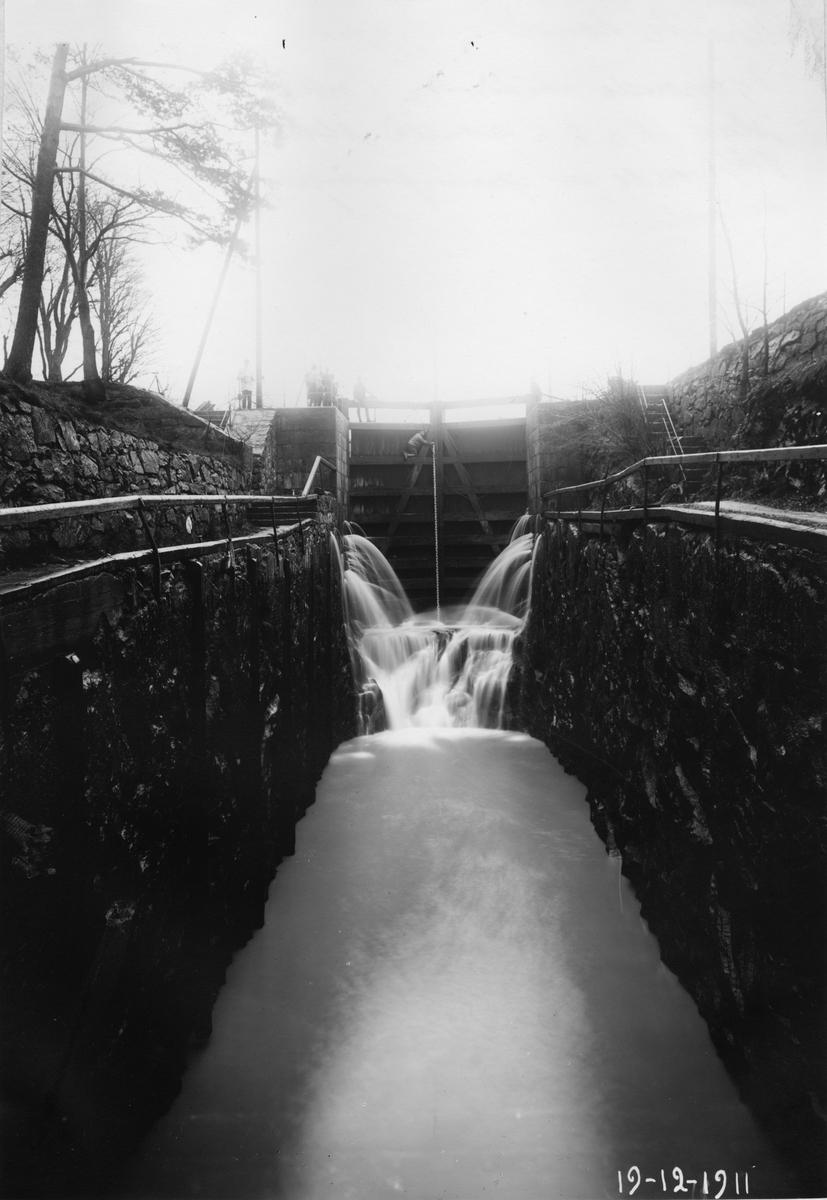Ombyggnad av Trollhätte kanal, Trollhättan.Vy visande slätheten i murverket bakom sluss nummer två i gamla slussleden före påbörjandet av sprängningen för dräneringstunneln.