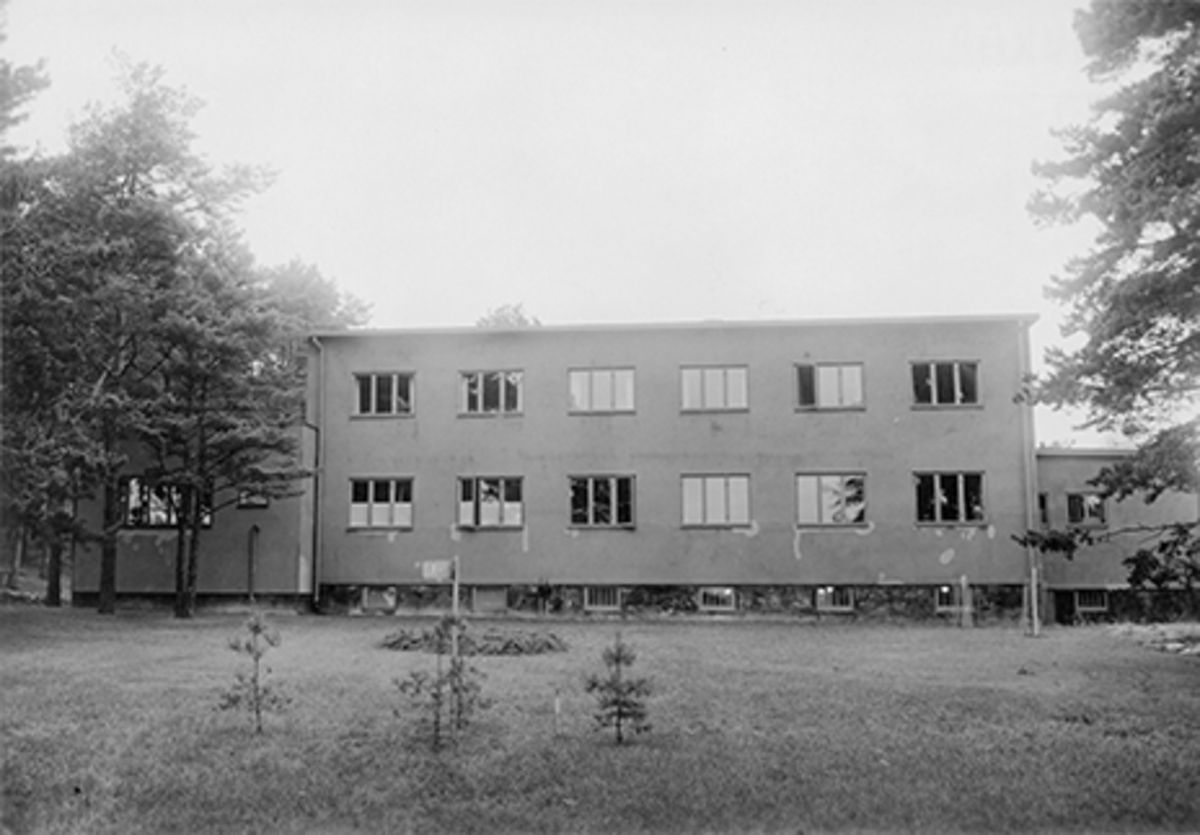 Sjukvårdsavdelningens byggnad på F 2 Roslagens flygflottilj. Exteriör, baksida.