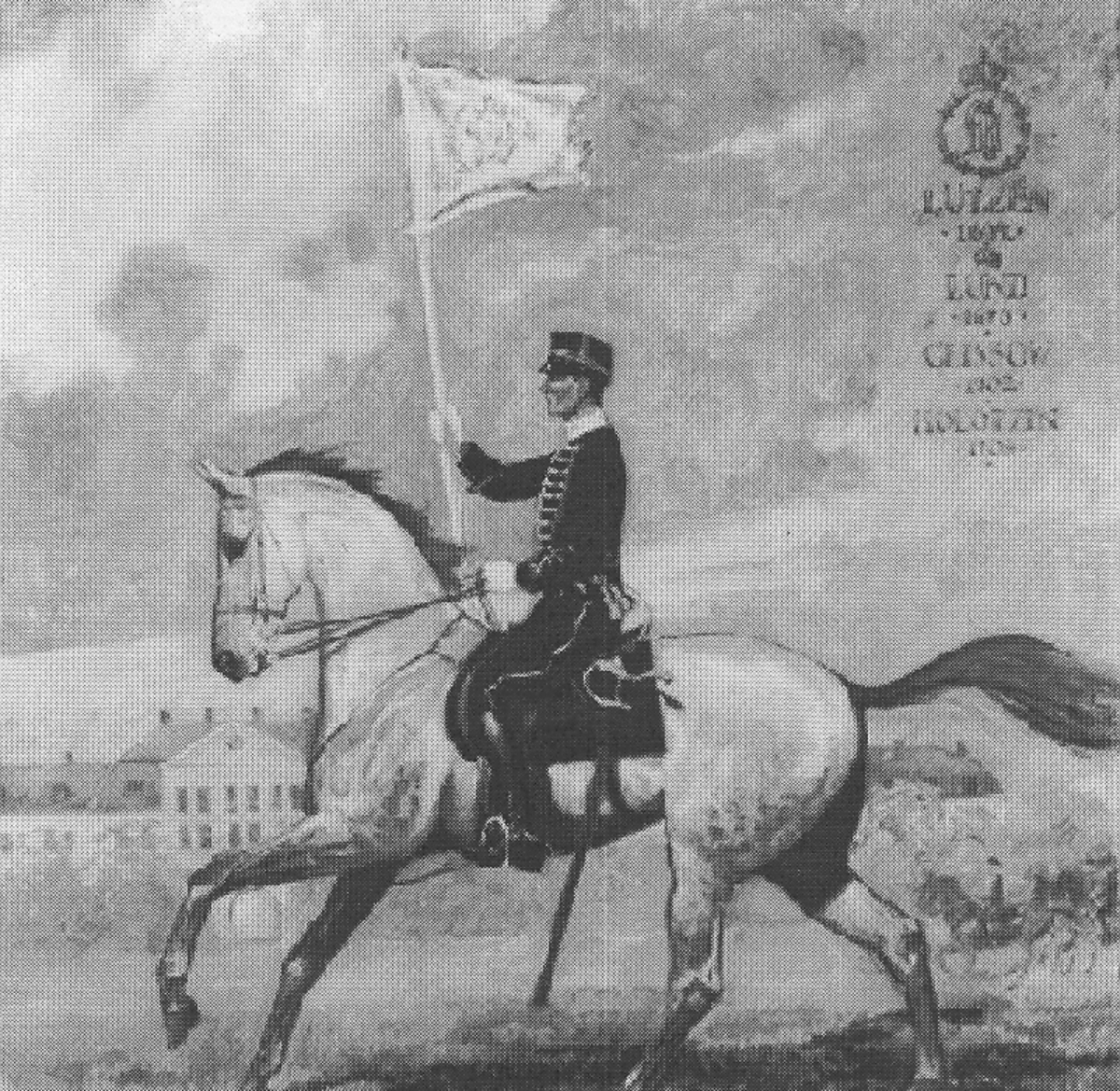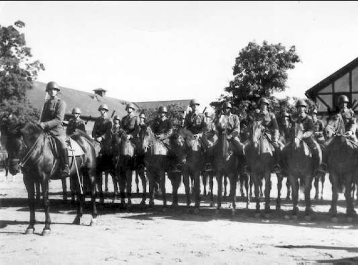 Andra skvadron 1946. Befäl främre raden från vänster: Curt Aaby-Ericsson kadettsergant, Sven Mattson fanjunkare, Gustaf Malmström fänrik, Gunnar Schildt ryttmästare, Gustaf Lundfanljunkare, Gunnar Zetterberg sergeant.