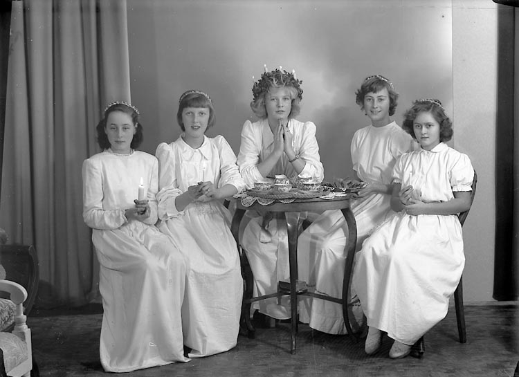 Enligt fotografens journal nr 7 19441950: "Luciorna, Anita Brant, Monika Lindqvist, Lena Olsson, Felltoff, Sylvia Johansson".