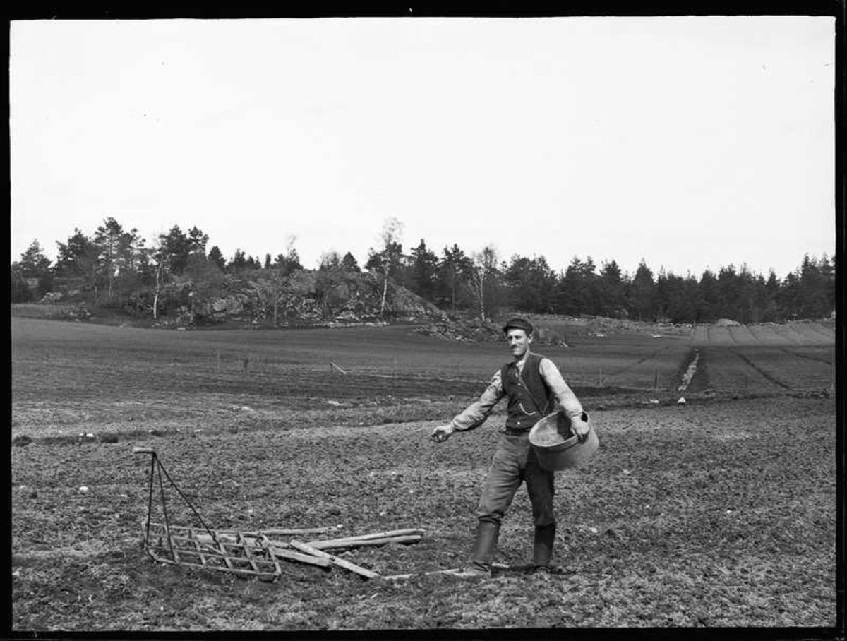 Abraham Jonsson, Hjärtum 1875-01-13, sår 23 maj 1908. Harven ligger kvar på åkern. I bakgrunden syns ingen väg fram till Brevik.