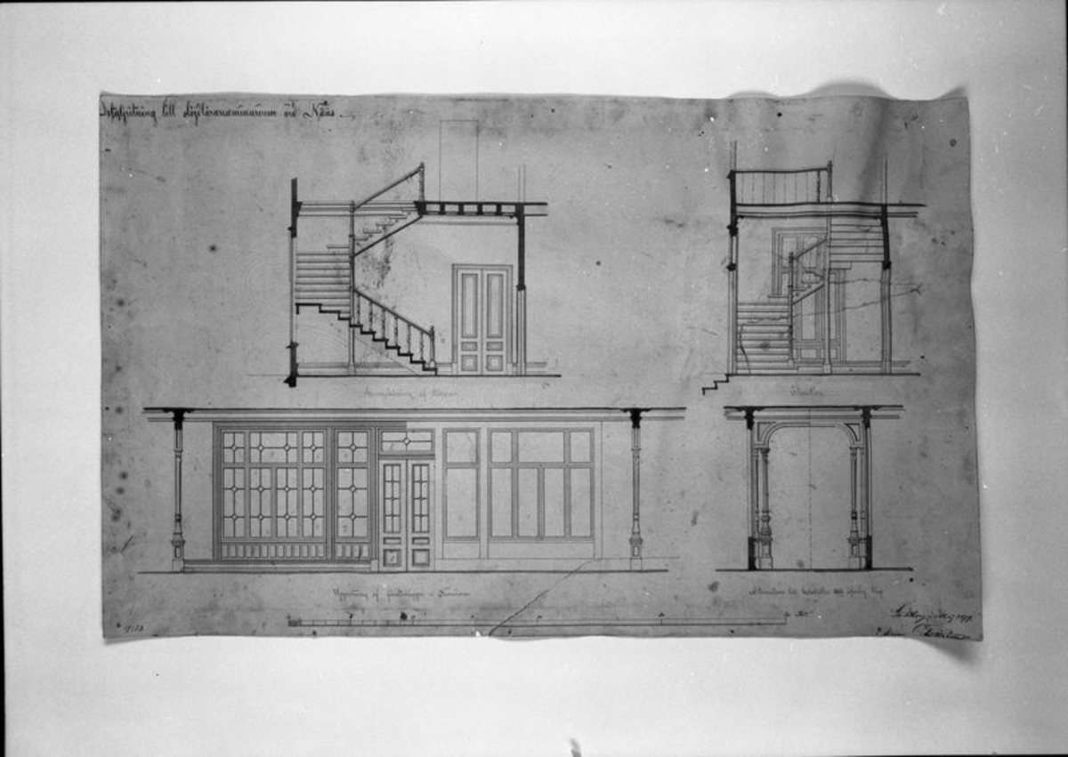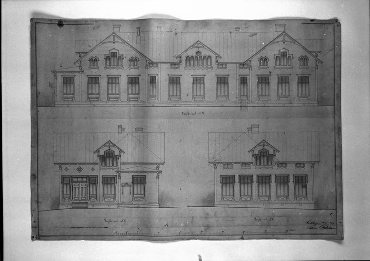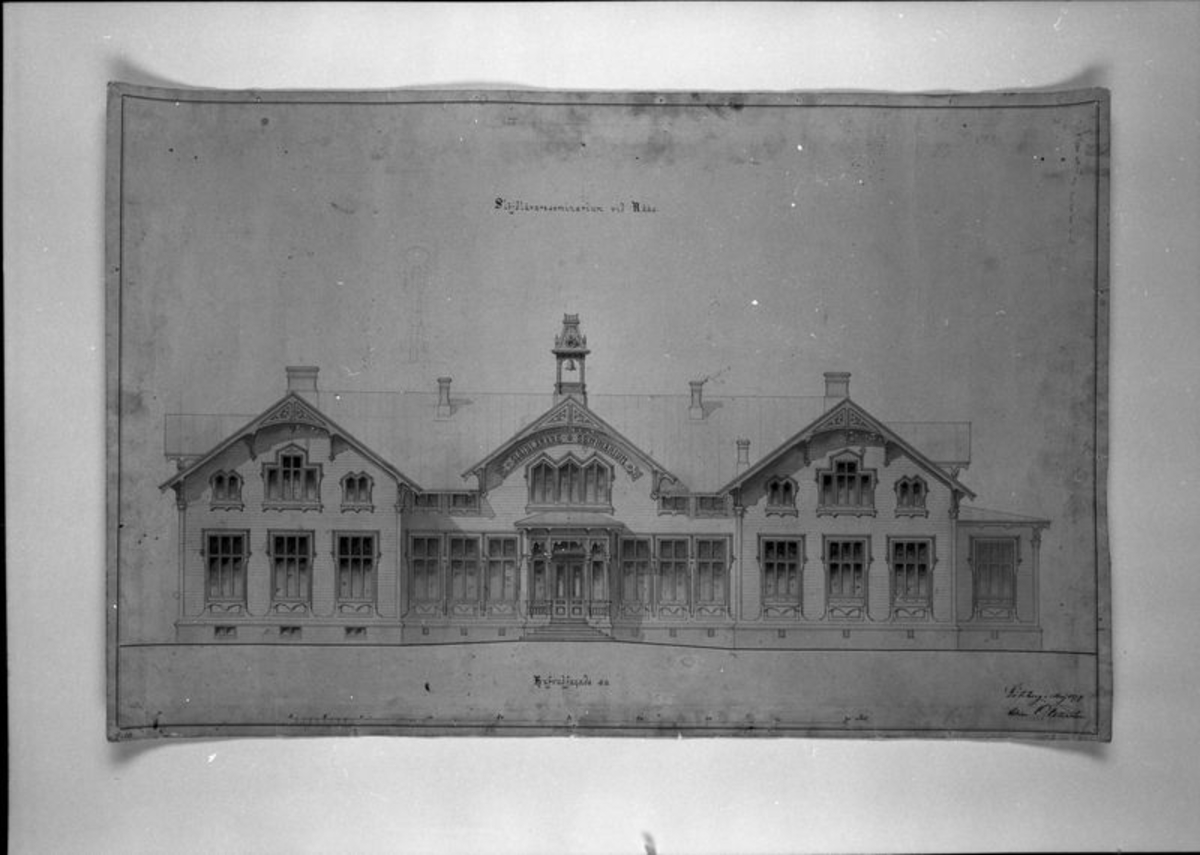 Ritning till slöjdlärarseminarium vid Nääs. Fasad mot nordväst, nordost, sydväst.