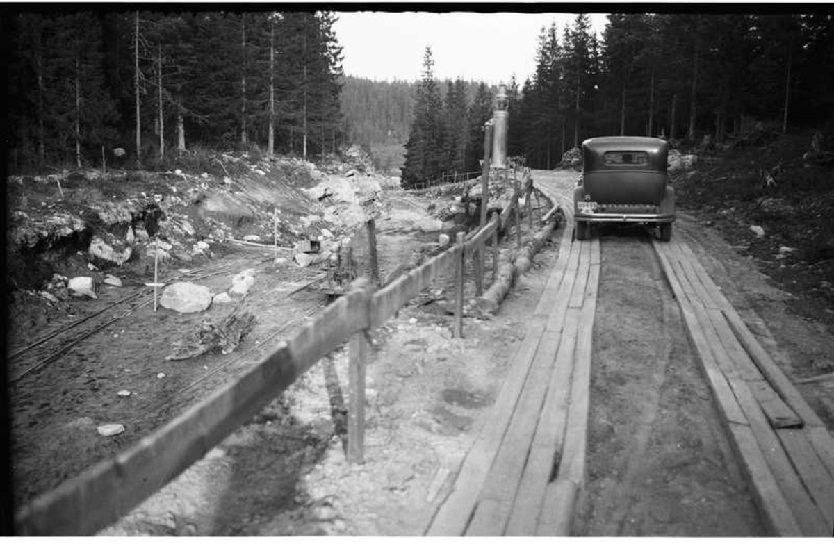 Stora landsvägen mellan Borås och Alingsås ombyggdes på en längre sträcka. Bilden tagen i trakten av Slätthult. Maj 1934.