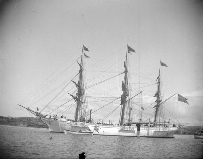 Enligt text som medföljde bilden: "Lysekil. Skeppsgossefartygen Najaden, Falken, Gladan från land 23/6 1899".