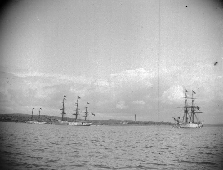 Enligt text som medföljde bilden: "Lysekil. Skeppsgossefartygen Najaden, Gladan och Falken från sjön. Liten parad. 24/6 1899".