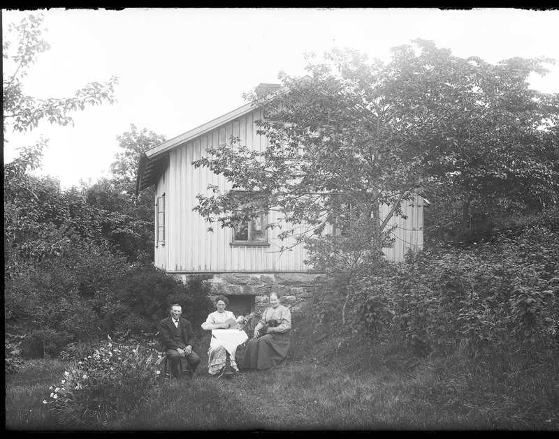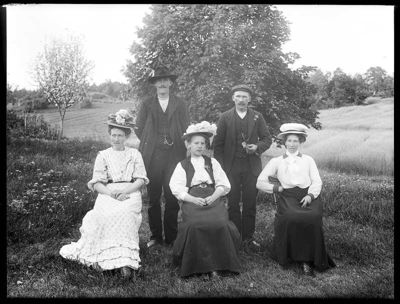Lotta i Brålla, Abraham Jonsson, Hjärtum 1875-01-13, Gerda Johansson, Hjärtum 1893-10-15, Oskar i Garnviken, Helga Hansson, bilden tagen i trädgården på Torpet (Arnstorp).
