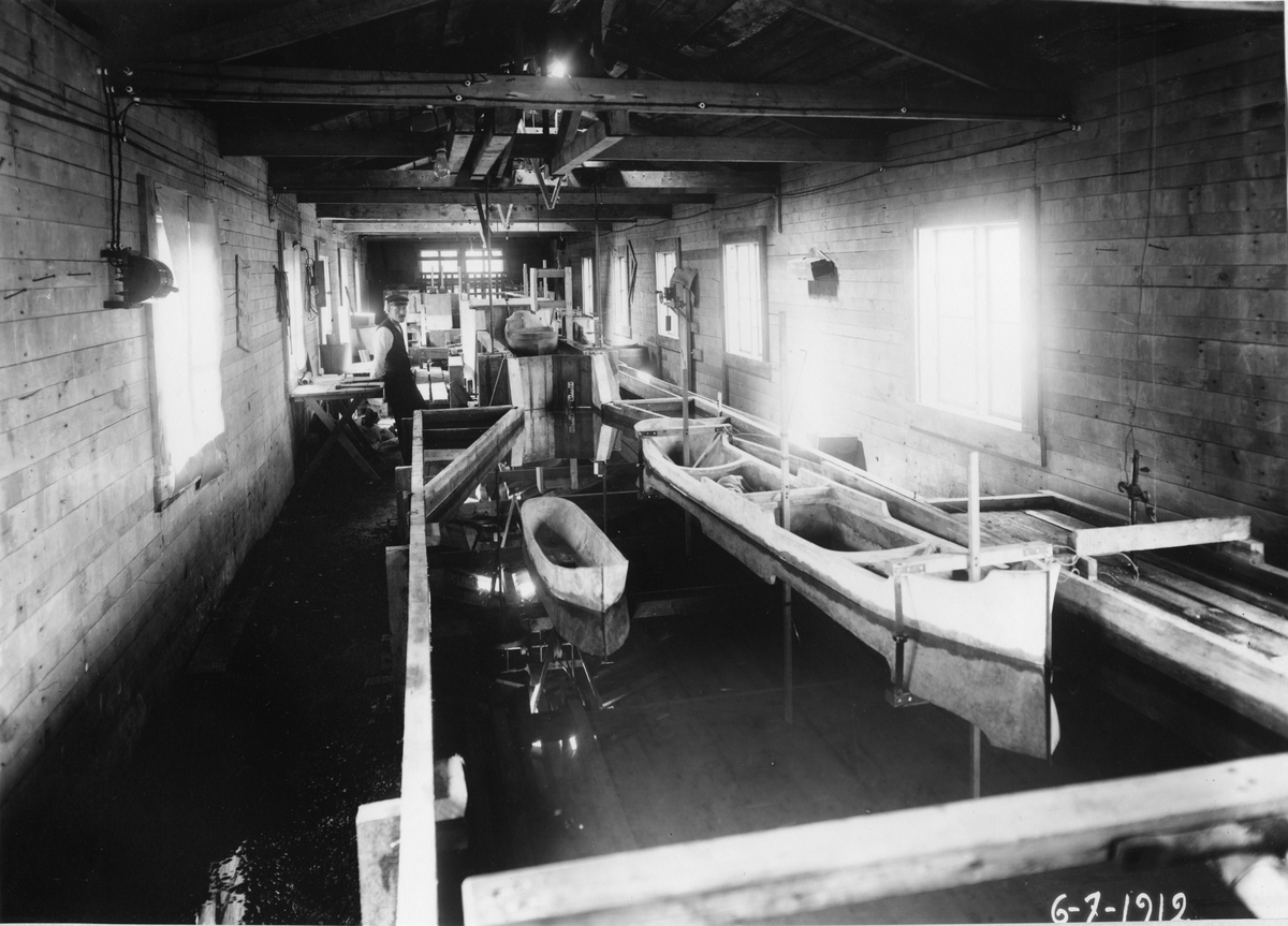 Änder i Lassadammen. Bredvid en man sittande i en roddbåt.