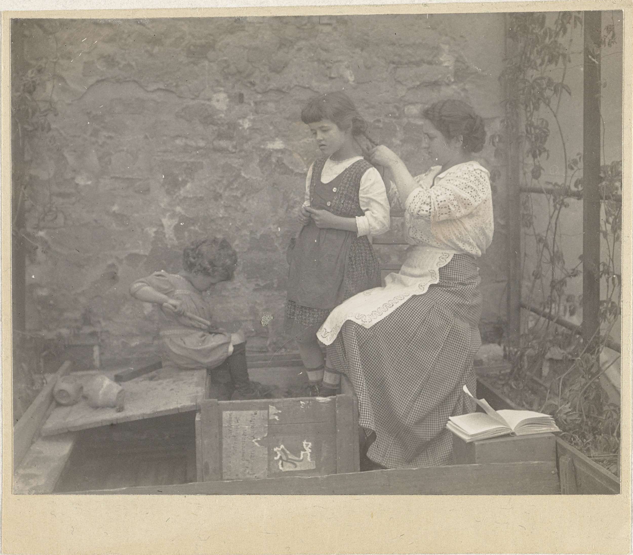Marba en Eckart Titzenthaler, kinderen van de fotograaf, met een onbekende jonge vrouwop het dakterras van het woonhuis Friedrichstrasse, Berlijn