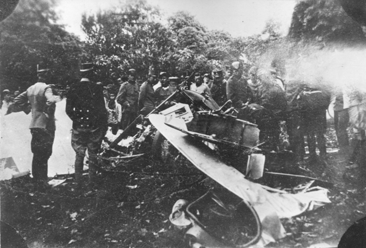 Haveri där två löjtnanter omkom. Folksamling och minnessten syns bakom resterna av det havererade flygplanet. Frontvy